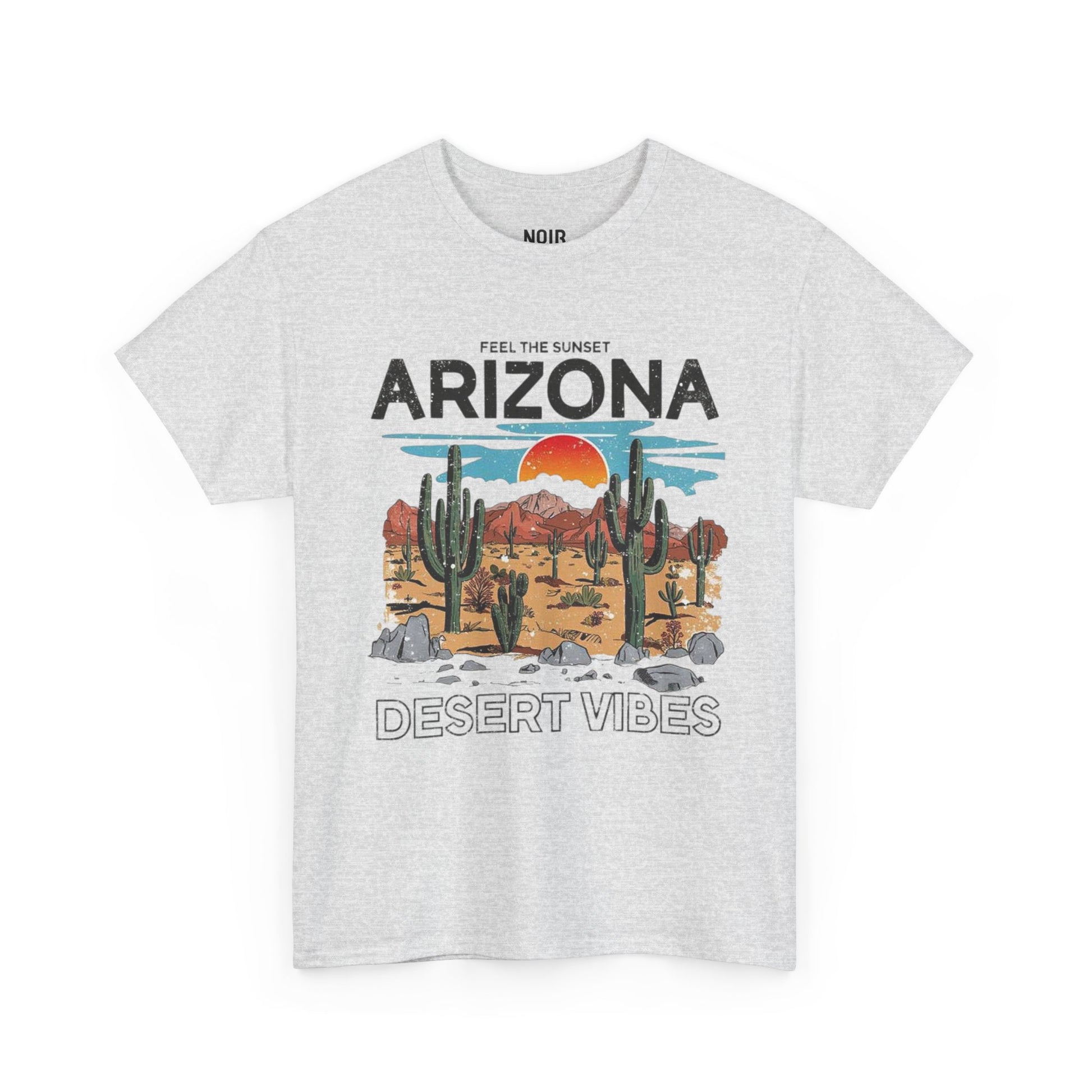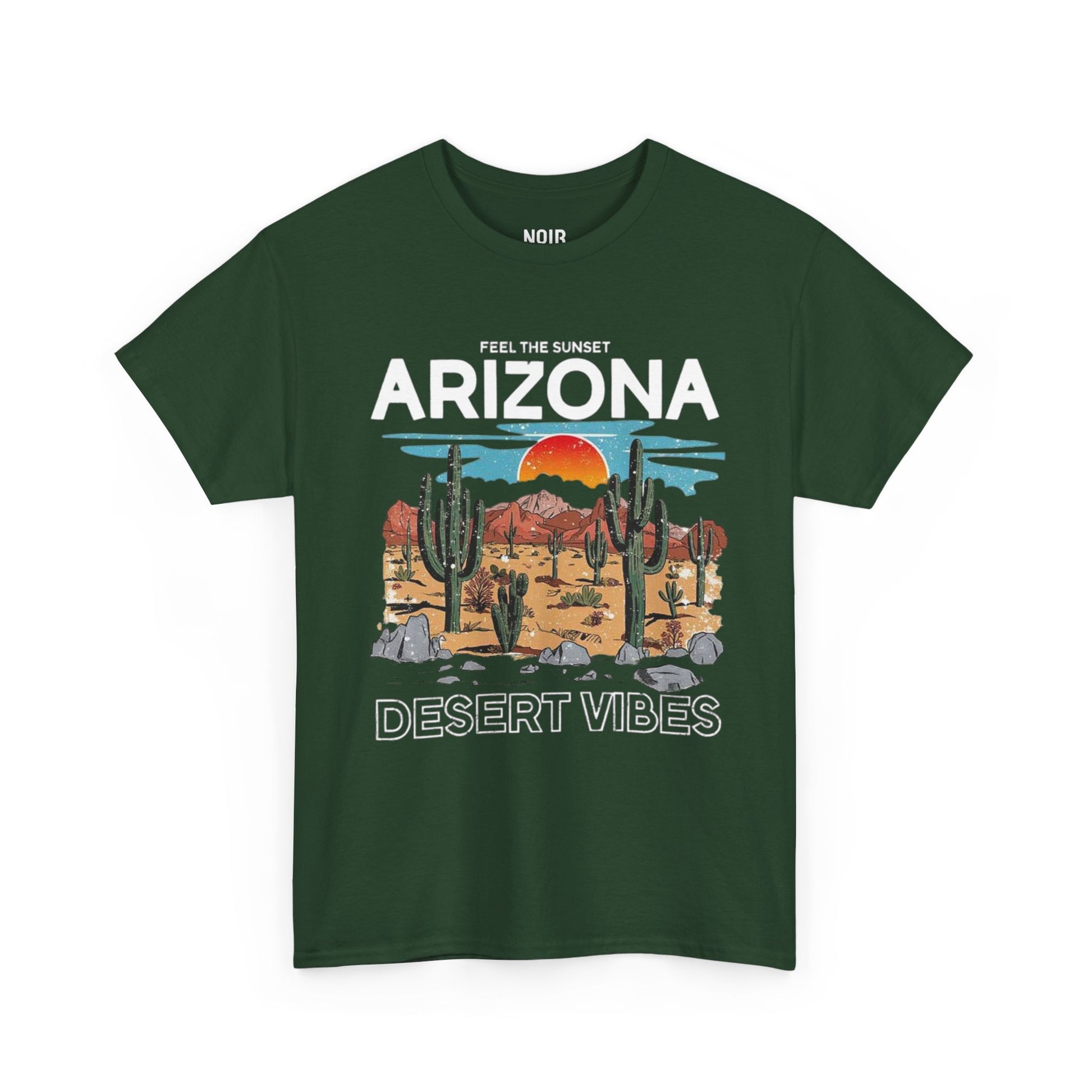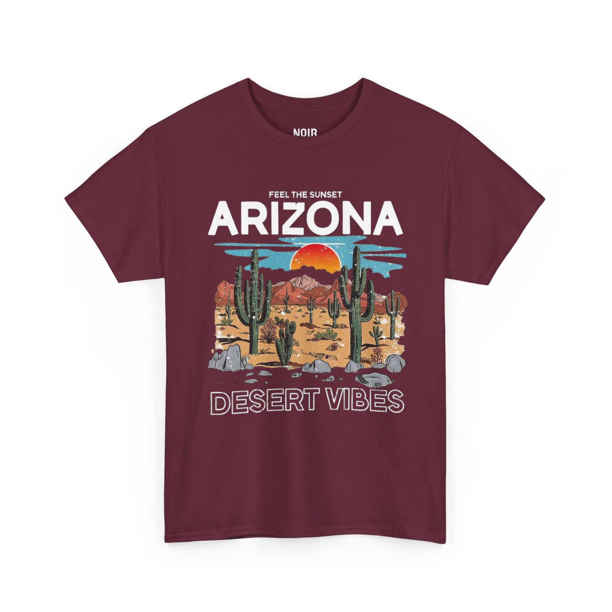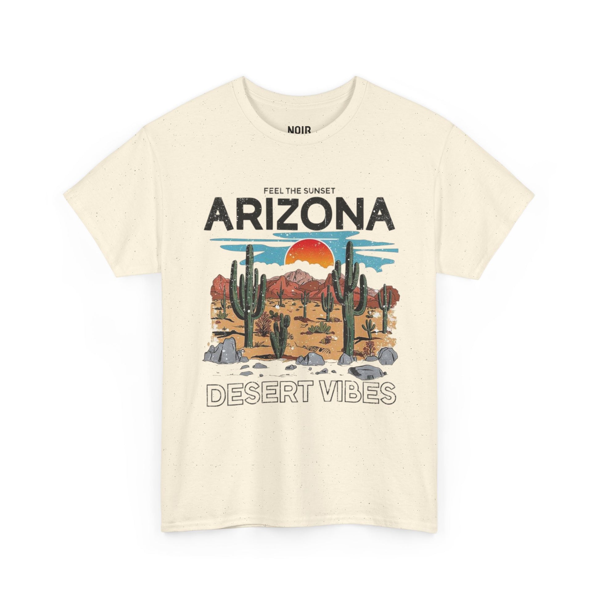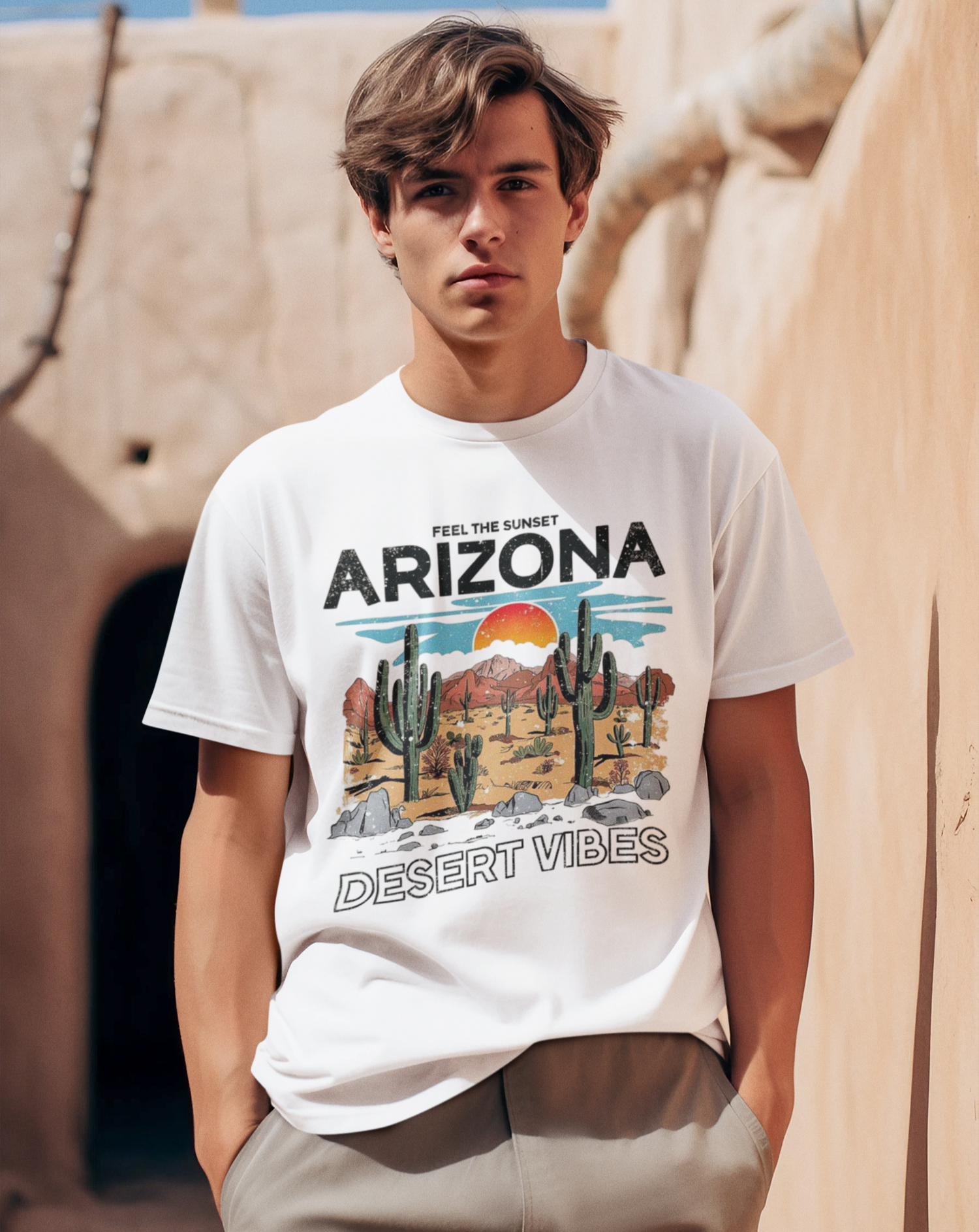 The ARIZONA “Desert Vibes” tee blends soft, breathable jersey with vintage sunset-and-saguaro artwork for relaxed character that stands out without trying. Wear it the road-trip way: light-wash straight jeans or tan chinos, a sage camp-collar shirt left open, and clean white sneakers or desert boots; add a single sleeve roll and a half-tuck to sharpen the line. Ready for anything coffee runs, classes, gallery strolls, weekend markets, concerts, road miles, and warm-weather nights. Throw on, feel cool, look collected - every time.