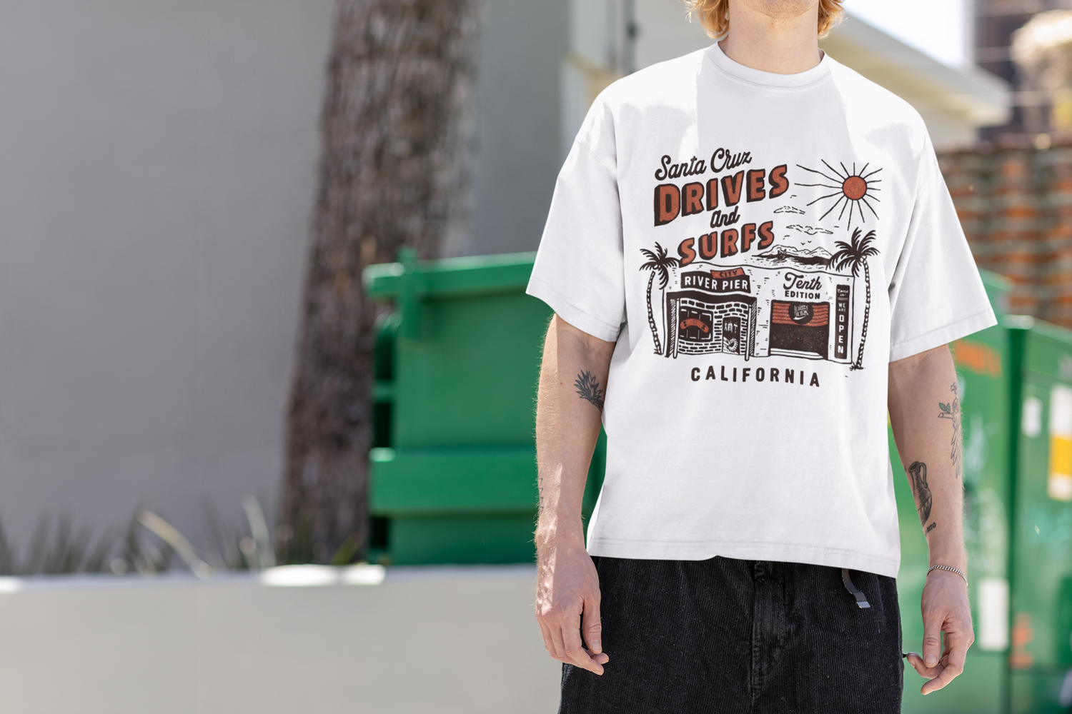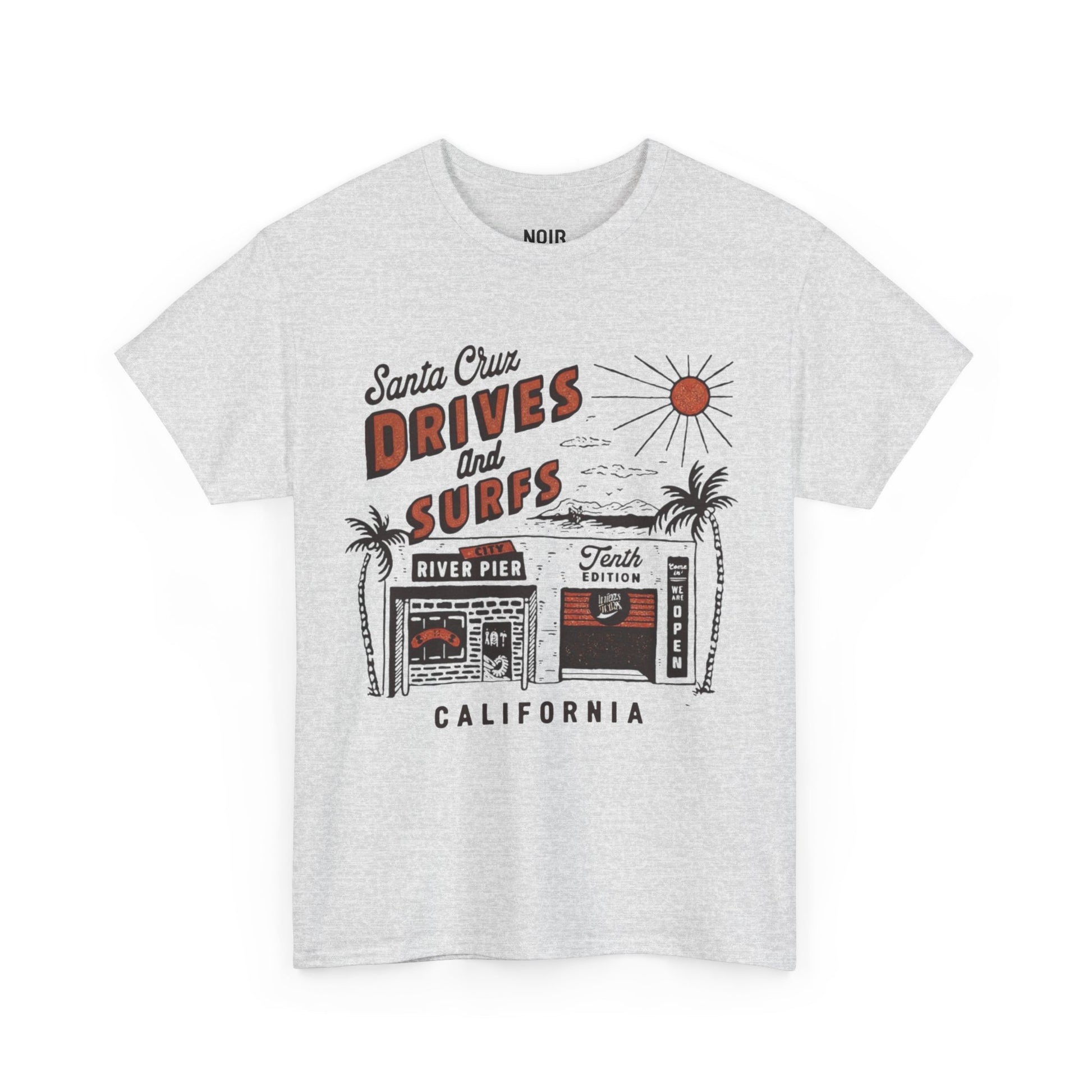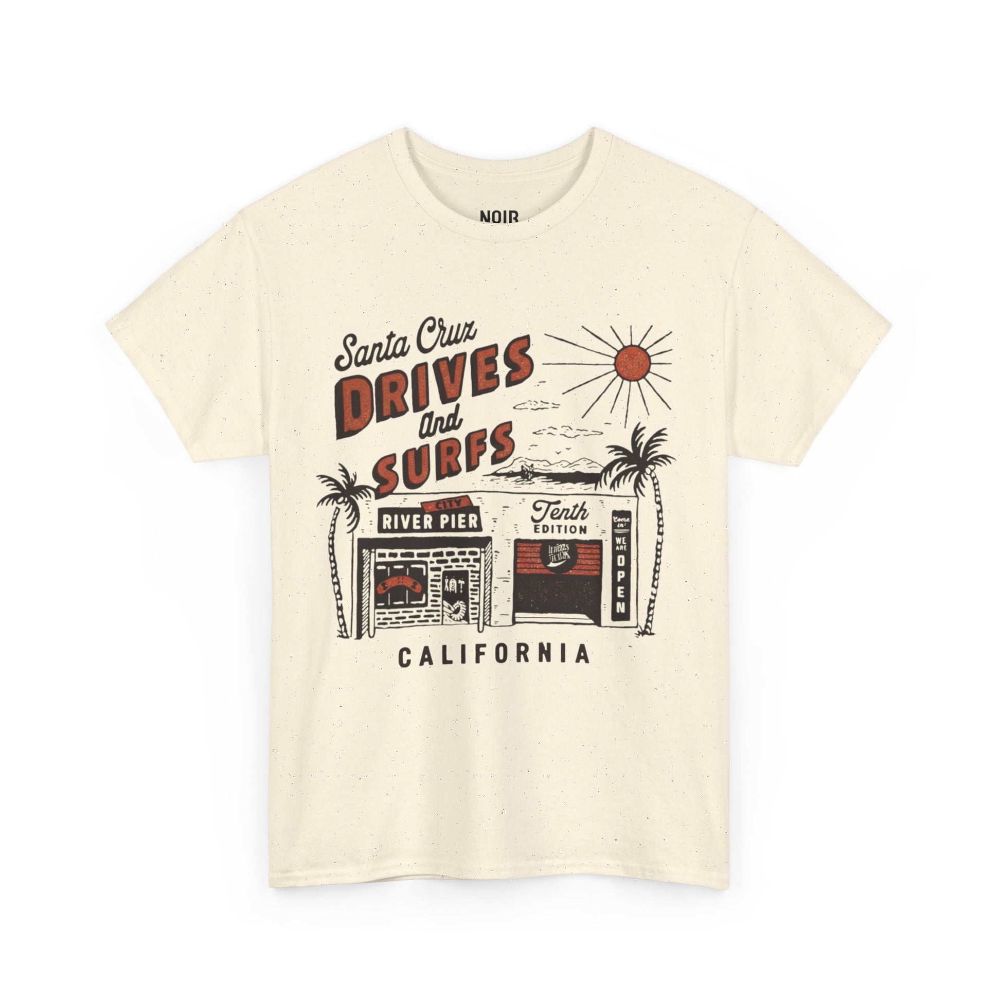 Hand-lettered Drives and Surfs tilts like a roadside marquee over a sketchy beach strip palms, a sun on high, the River Pier sign, and a shack window chalked with “Tenth Edition” and “We’re Open.” The art riffs on bumper-sticker typography, zine flyers, and board-shop receipts grainy lines, sun-burnt orange, and salt-black shadows so it feels like a day’s worth of sand and asphalt pressed into paper. It’s pure coast-town rhythm: cruise the avenue, check the break, grab tacos, repeat. Made for daily rotation throw it on with light wash denim and you’re out the door.