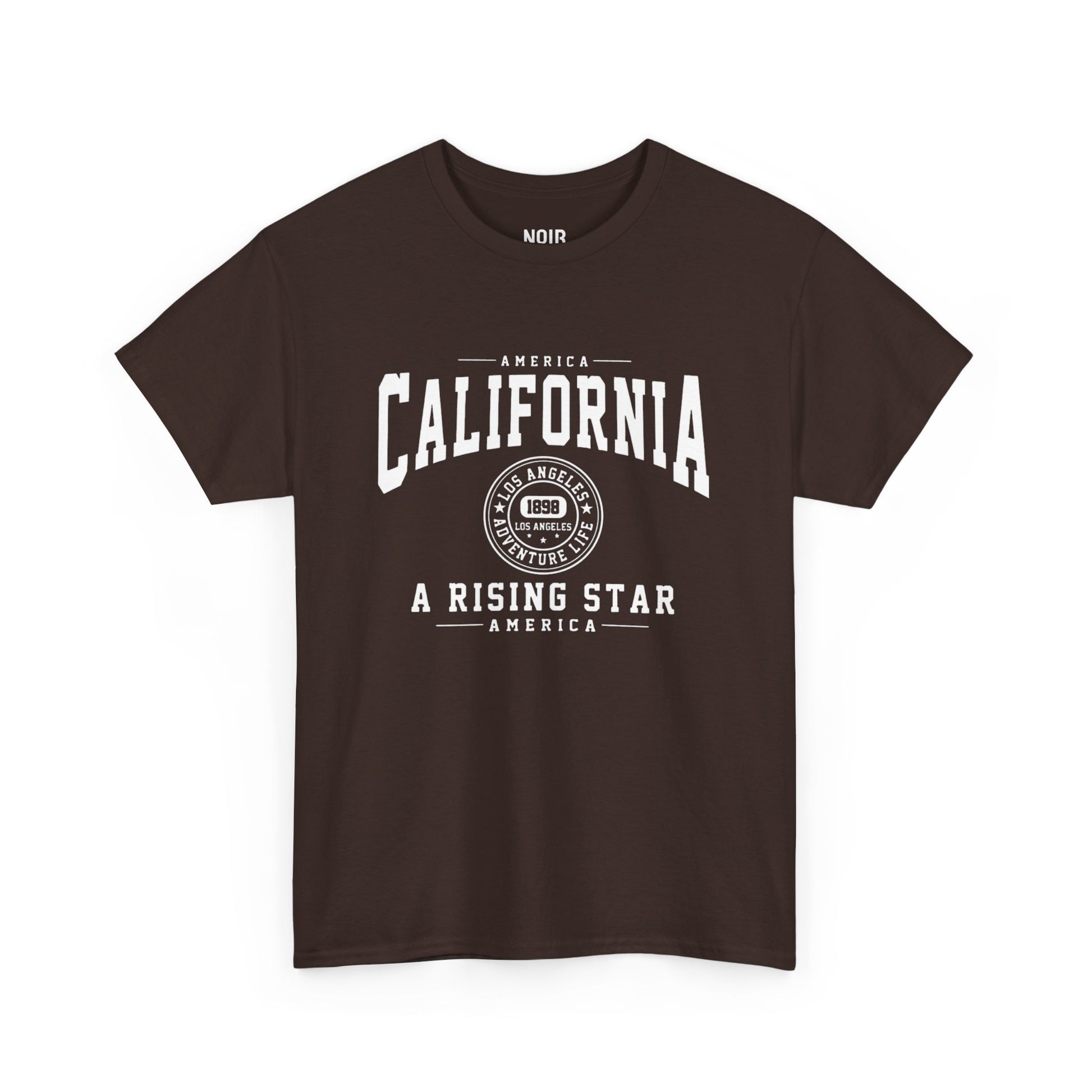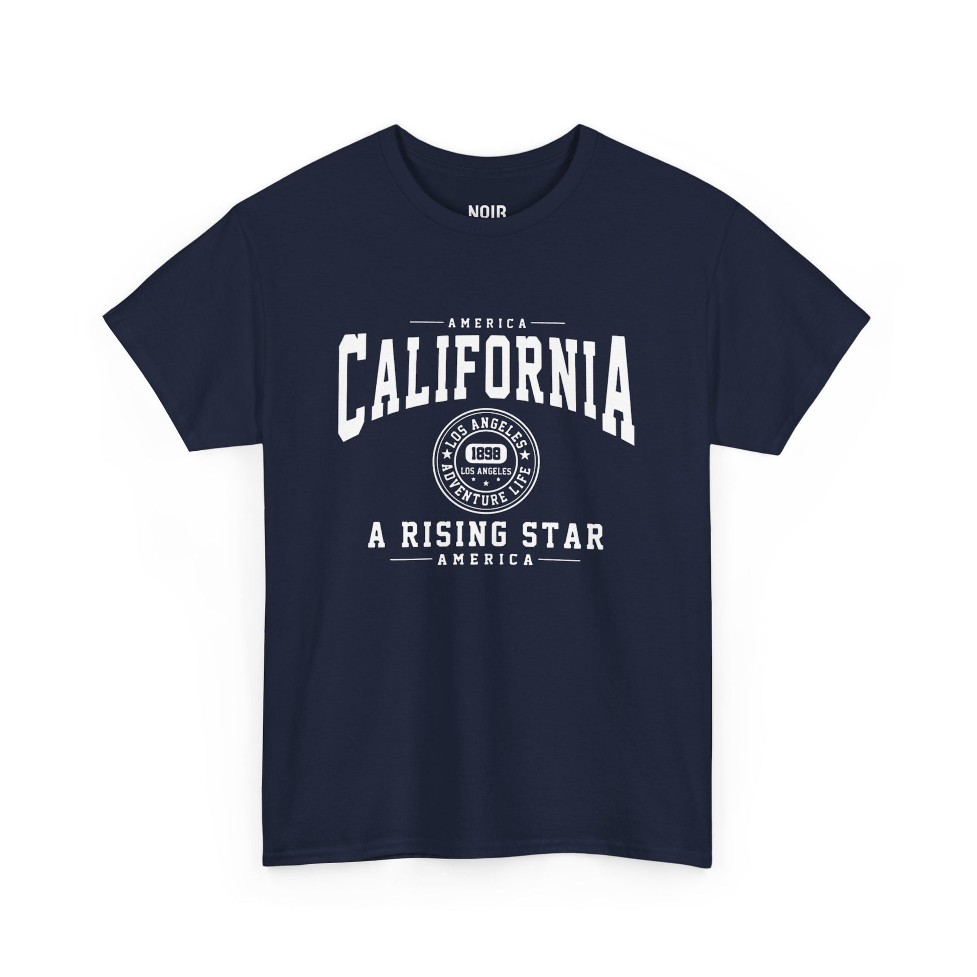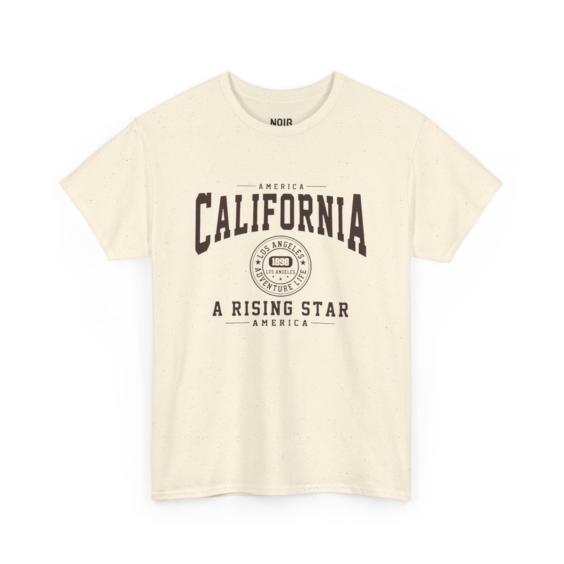 Tall varsity letters arc “CALIFORNIA” between fine rules, centered by a Los Angeles roundel with 1989 and star accents, and grounded with the bold banner A RISING STAR. The look draws from vintage state-college athletics and West Coast marquee signage—clean, confident, a nod to LA’s climb-and-shine spirit. It represents optimism and forward motion: keep moving, keep rising. Built for everyday wear—throw it on with denim for an easy, go-anywhere fit.
