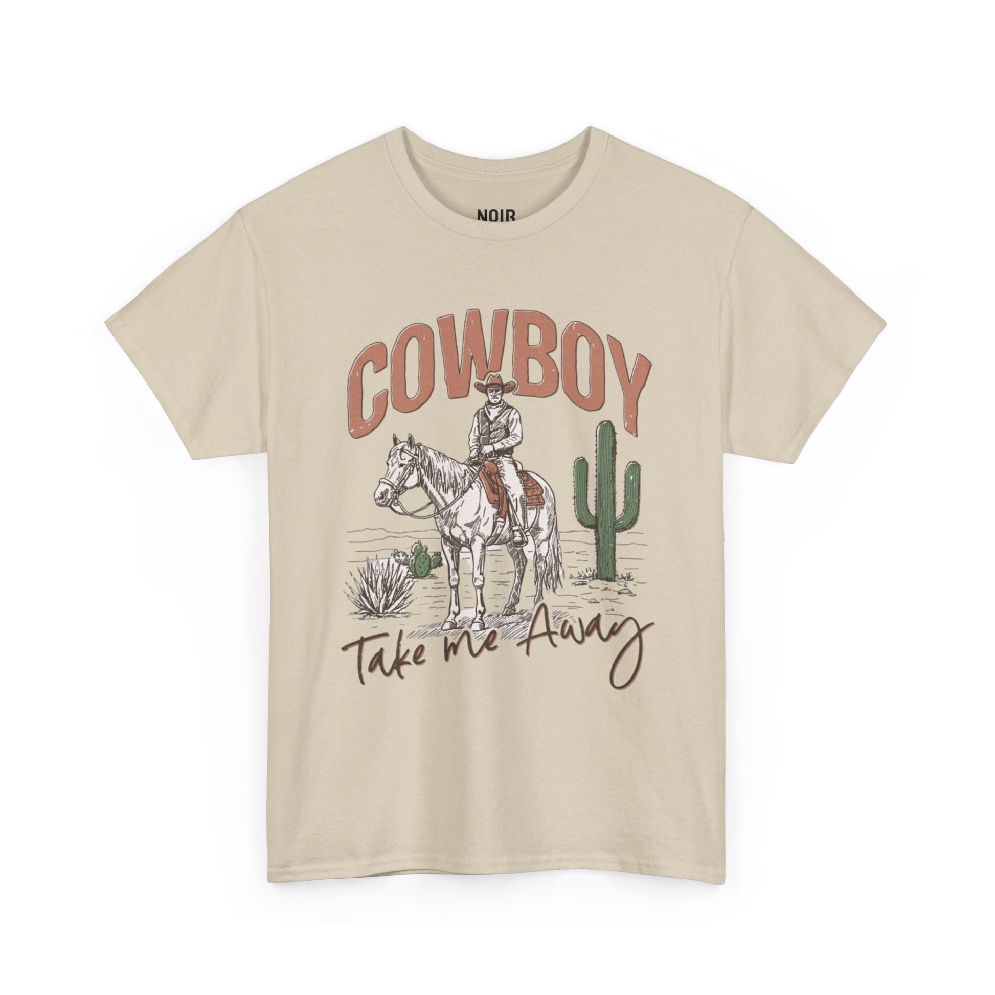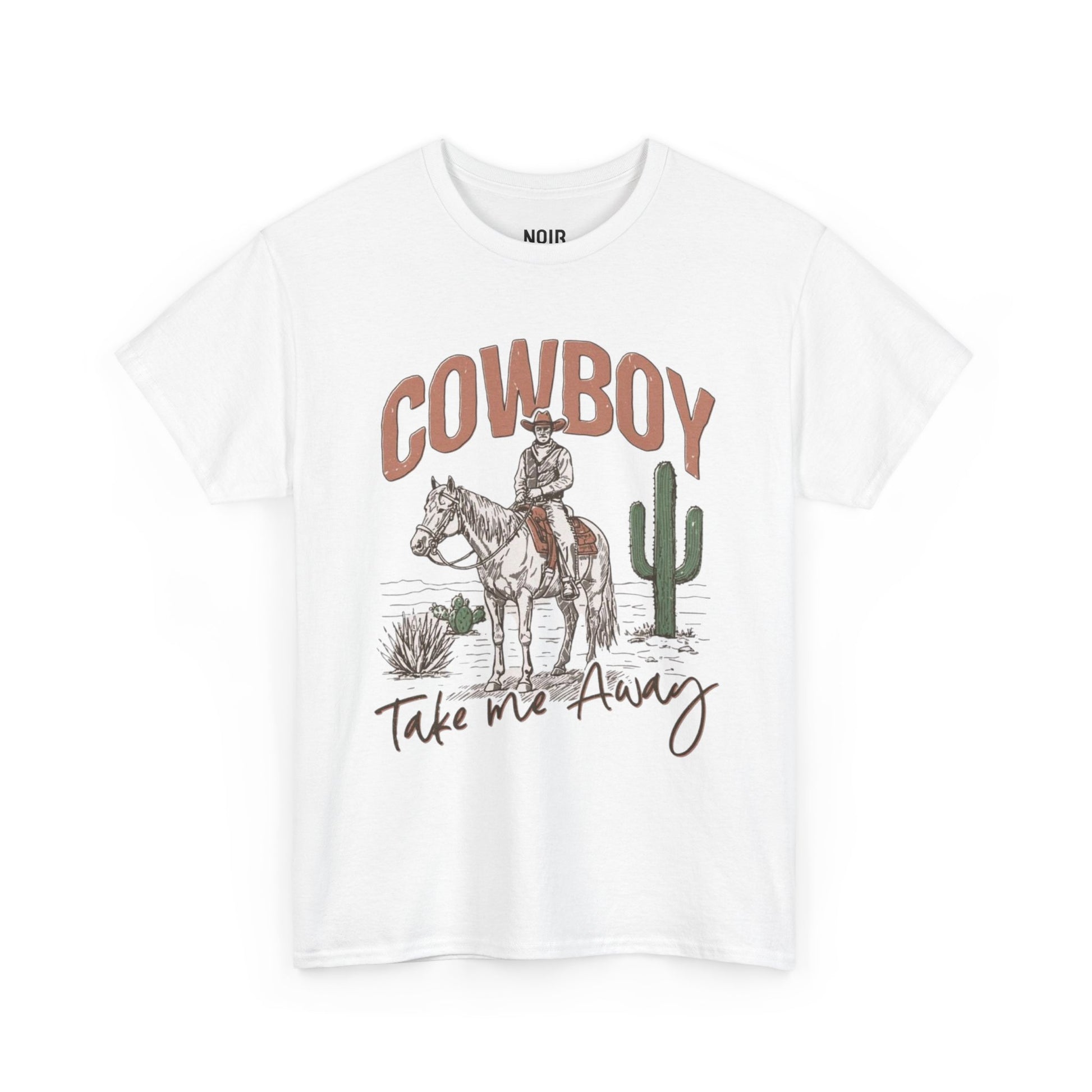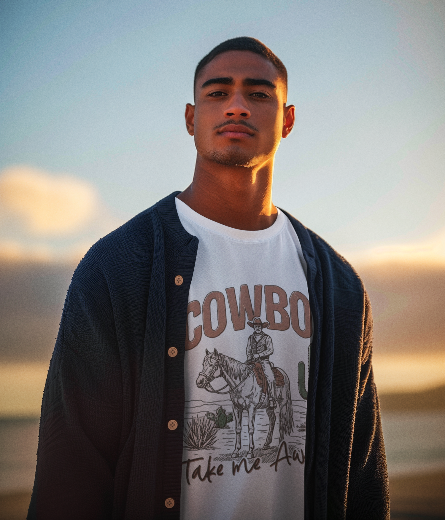 Soft, breathable jersey meets a hand-drawn desert scene cowboy, saguaro, and “Take me away” script for a laid-back tee with nostalgic charm. Style it the rodeo-romance way: high-waisted light-wash jeans or cutoffs, a tan leather belt, ankle boots or white court sneakers, and a cropped denim or fringe jacket; half-tuck the hem and roll the sleeves once to keep it sharp. Weekday-to-weekend ready coffee runs, classes, markets, concerts, road trips, and golden-hour photos. True to size for a clean drape; size up for an easy, festival vibe. Feel relaxed, look charming - every time.