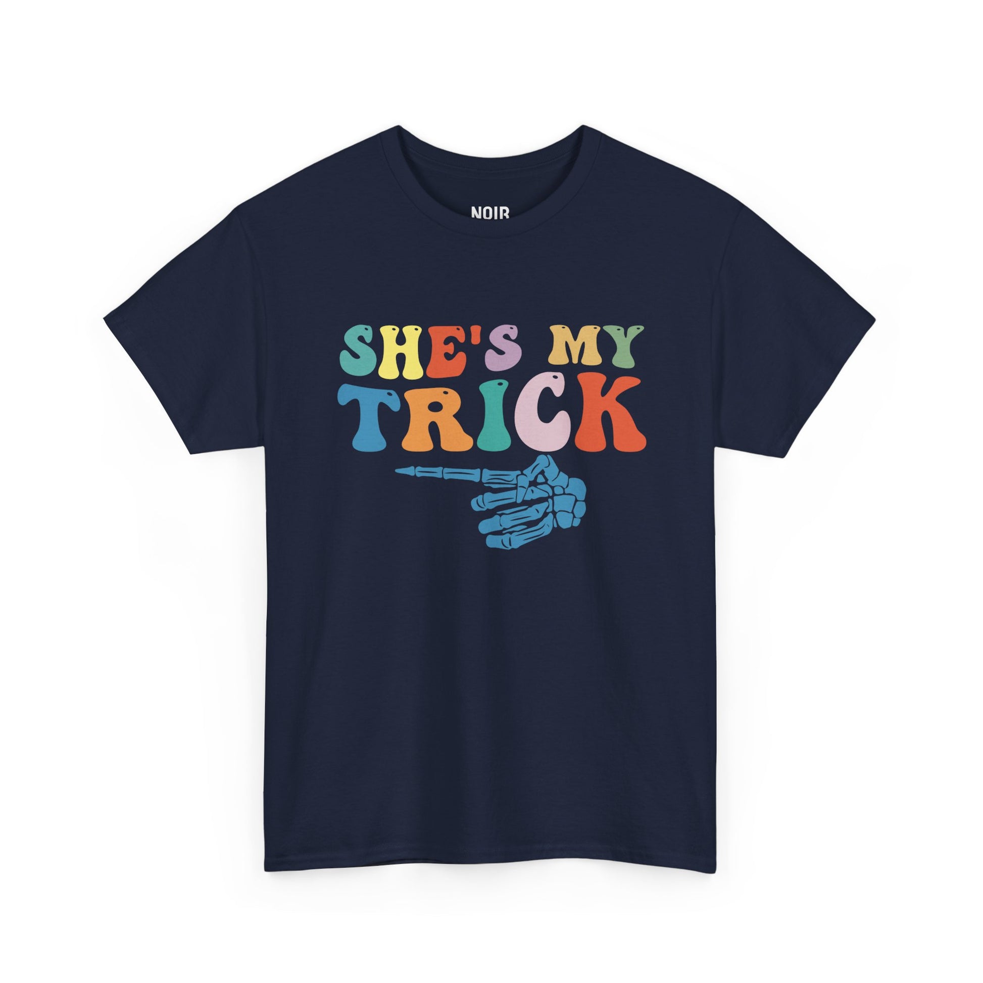 A matched pair built for mischief and sweetness: retro groovy letters in candy shop colors ride a midnight black tee while a blue skeleton hand points straight to your person. The print borrows its palette from vintage Halloween wrappers sherbet orange, mint, lilac, butter yellow softened with light distress for that lived-in ’70s poster feel. The concept sprang from couple energy on spooky nights: one of you is the trick - playful, bold, always plotting the fun; the other is the treat - warm, sweet, and impossible to resist. Worn side by side, the hands connect the joke and the hearts, turning a crowd into your photo backdrop. Easy to style with denim or joggers and sneakers, perfect for pumpkin-patch dates, house parties, and every cozy fall errand together. Mischief meets affection two tees, one team.