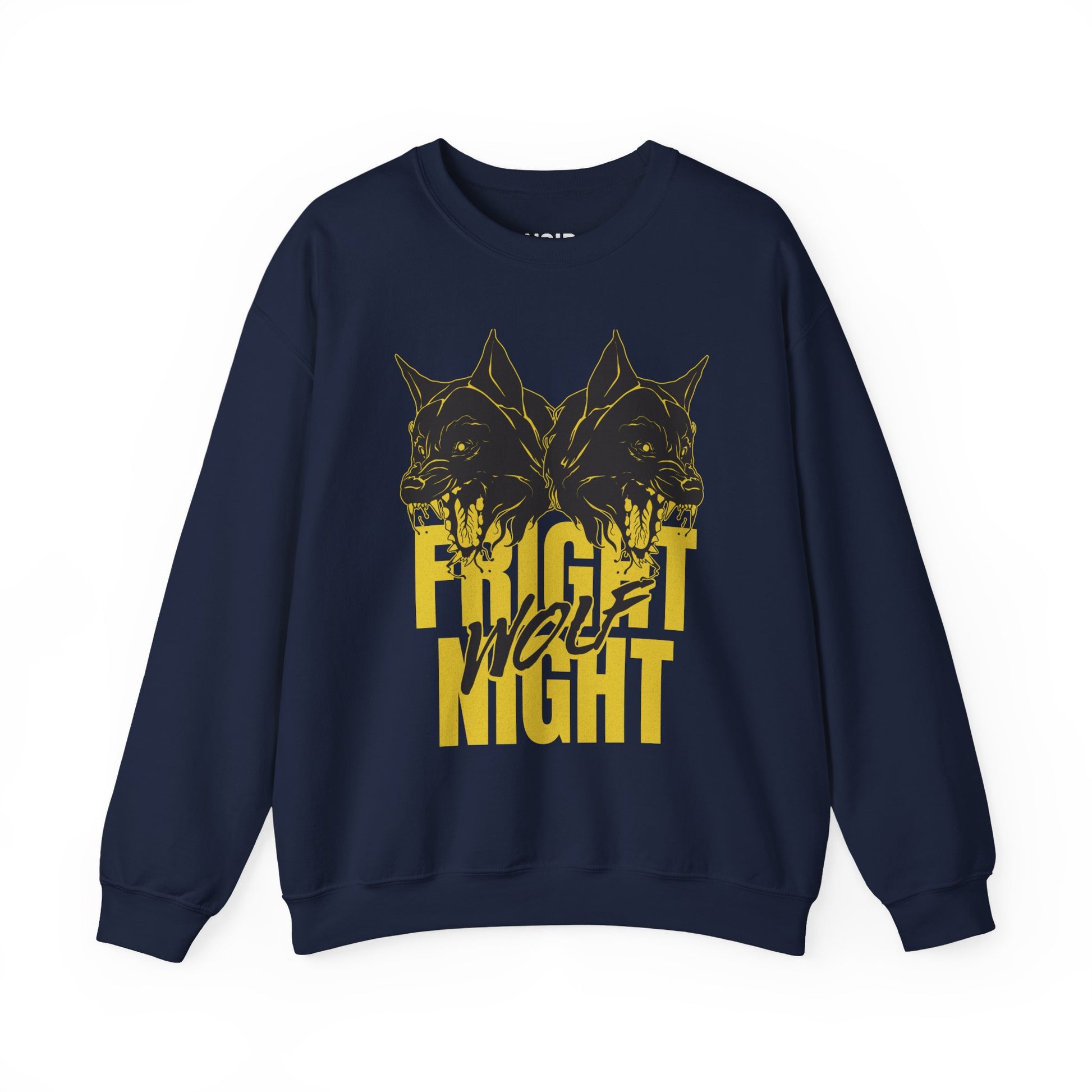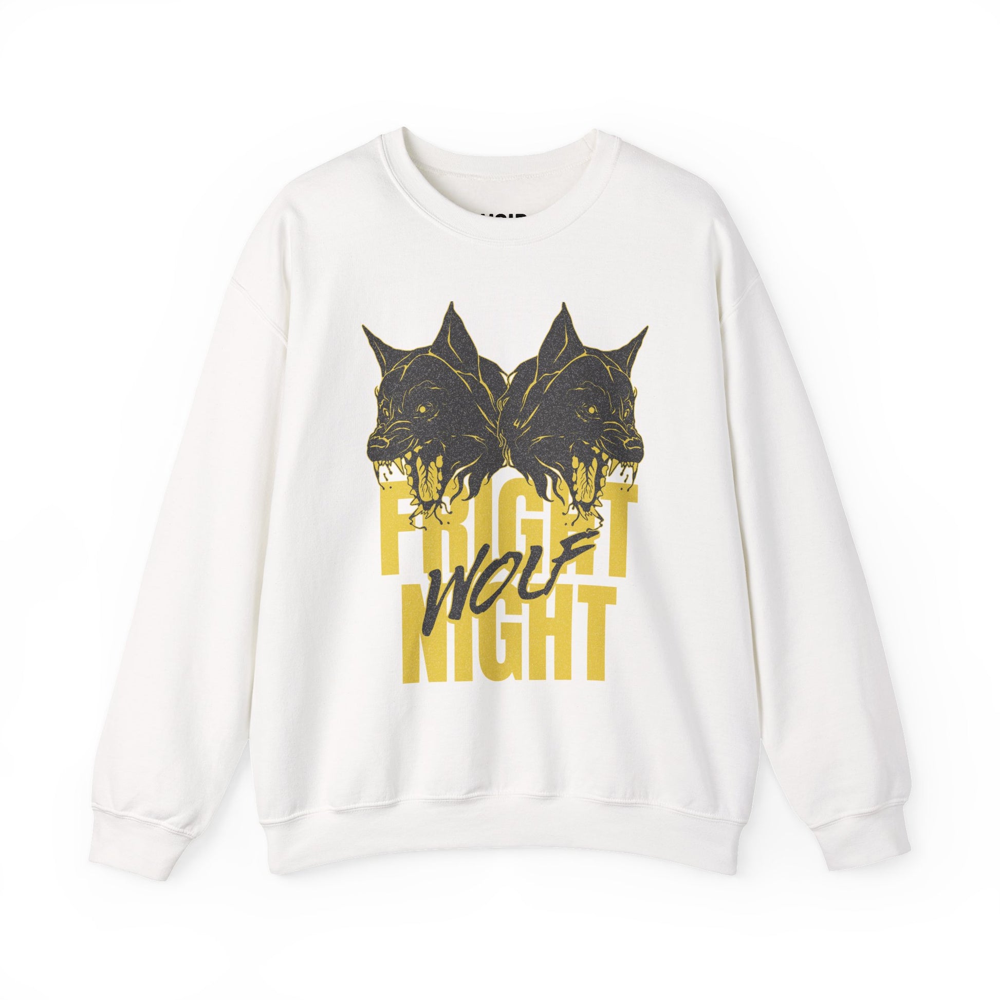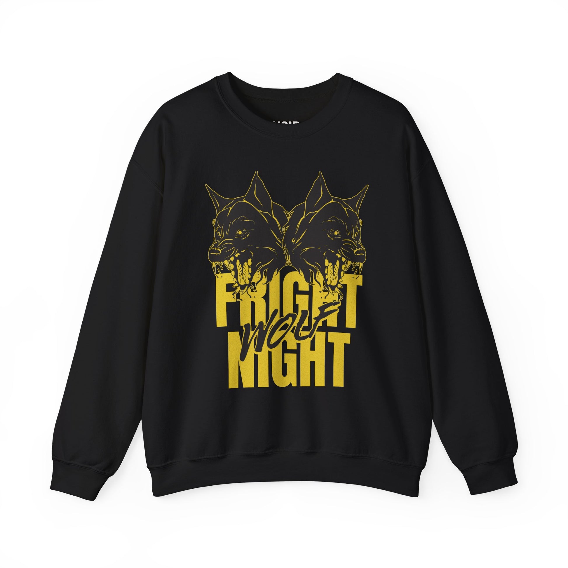 Two mirrored wolves snarl nose-to-nose above towering mustard FRIGHT NIGHT type, with WOLF slashed across in claw-mark brush script; scratchy charcoal linework, halftone fur, spit highlights, and lightly distressed edges give the print a photocopied gig poster punch tight moon mustard and soot-black tones that hit like a title card pasted at 2 a.m. The symmetry hints at the night’s split personality fear and thrill, hunter and heartbeat so when you throw it on with black denim, cargoes, or a flannel at the waist, the wolves do the talking while you carry pure midnight-hunt energy. Cozy fleece, built for heavy rotation.