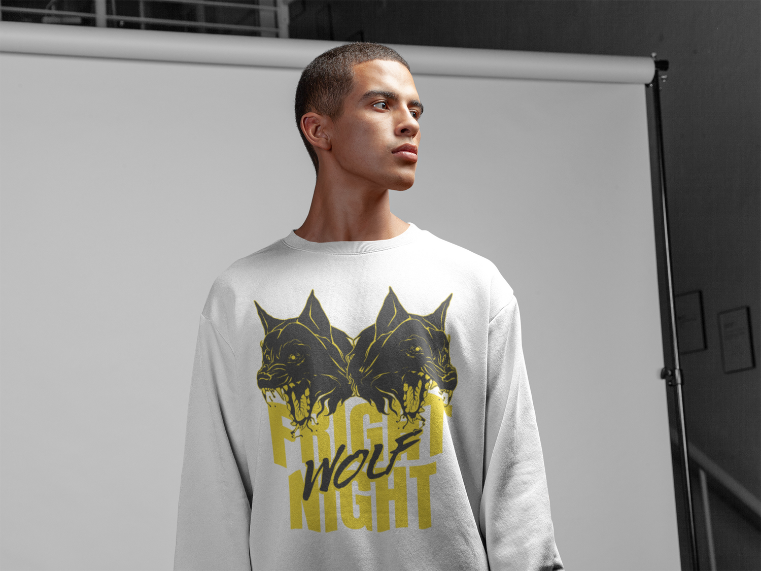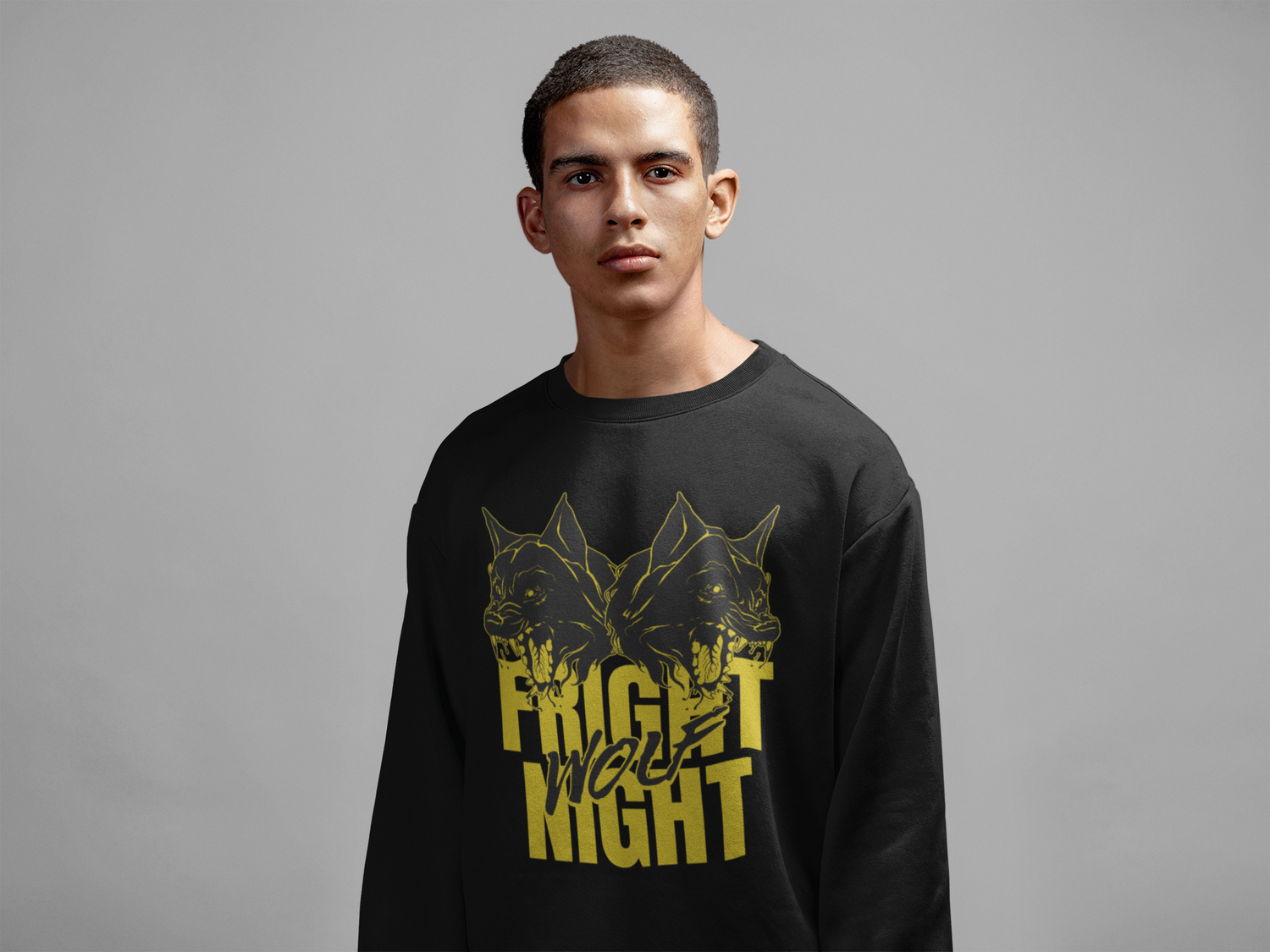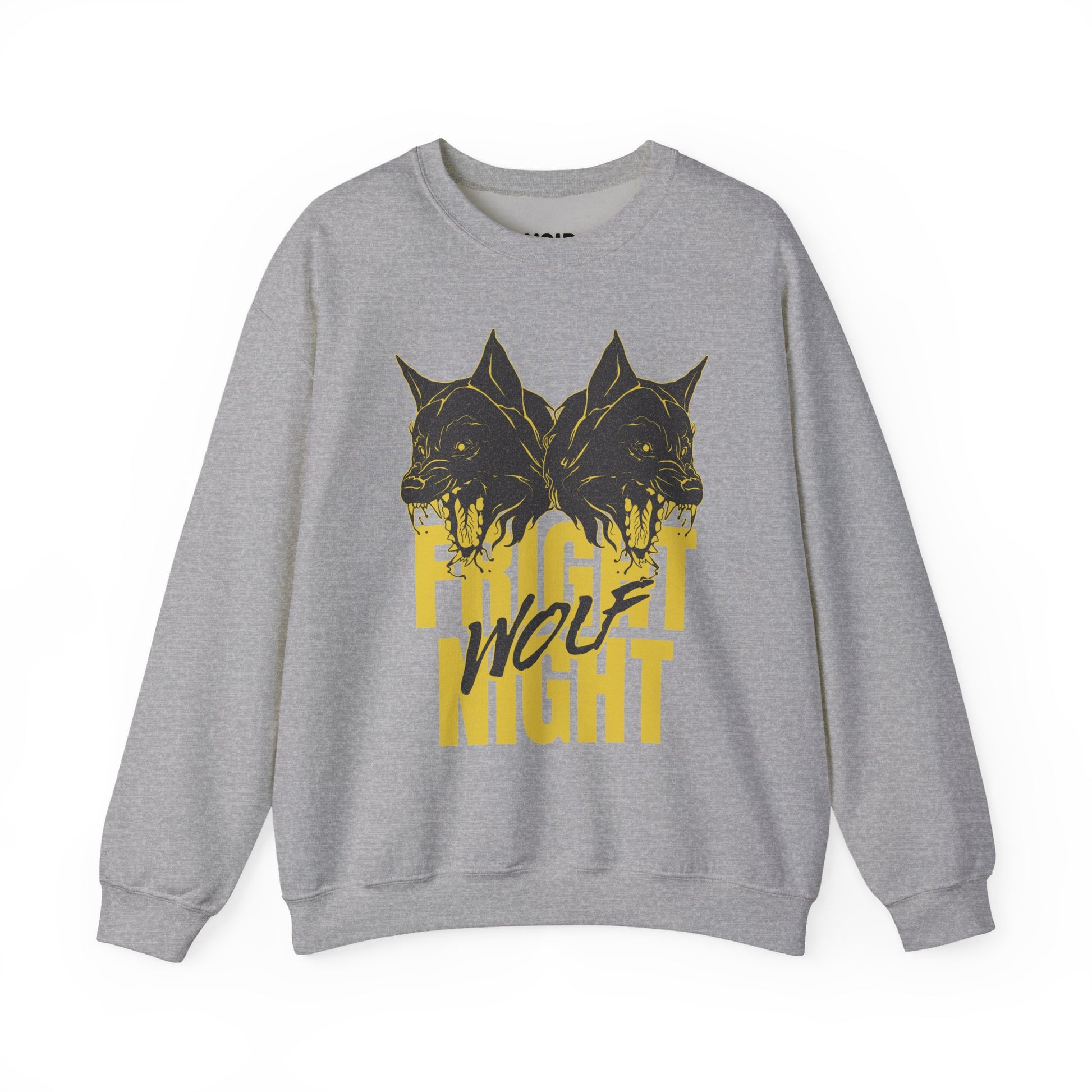 Two mirrored wolves snarl nose-to-nose above towering mustard FRIGHT NIGHT type, with WOLF slashed across in claw-mark brush script; scratchy charcoal linework, halftone fur, spit highlights, and lightly distressed edges give the print a photocopied gig poster punch tight moon mustard and soot-black tones that hit like a title card pasted at 2 a.m. The symmetry hints at the night’s split personality fear and thrill, hunter and heartbeat so when you throw it on with black denim, cargoes, or a flannel at the waist, the wolves do the talking while you carry pure midnight-hunt energy. Cozy fleece, built for heavy rotation.