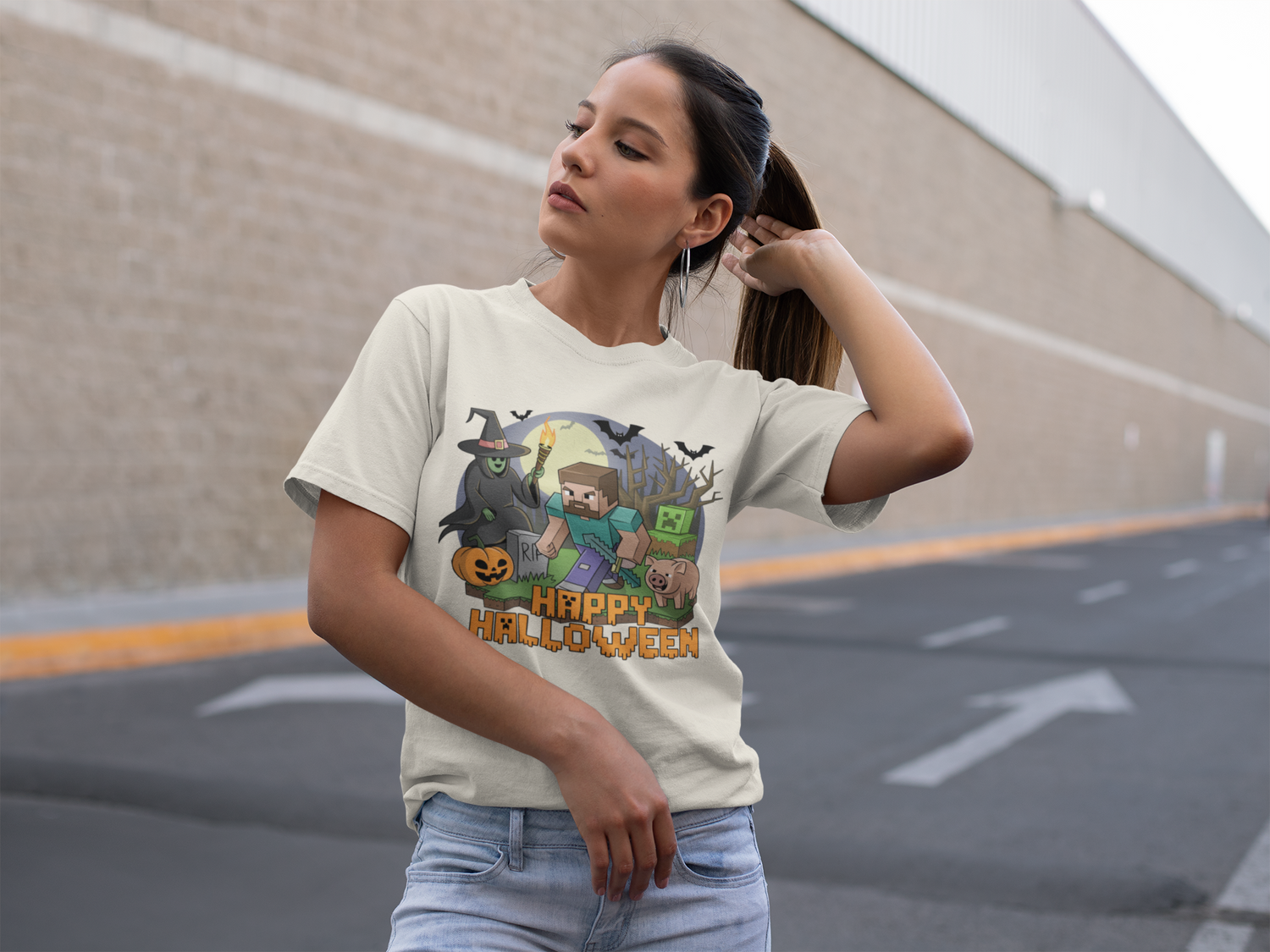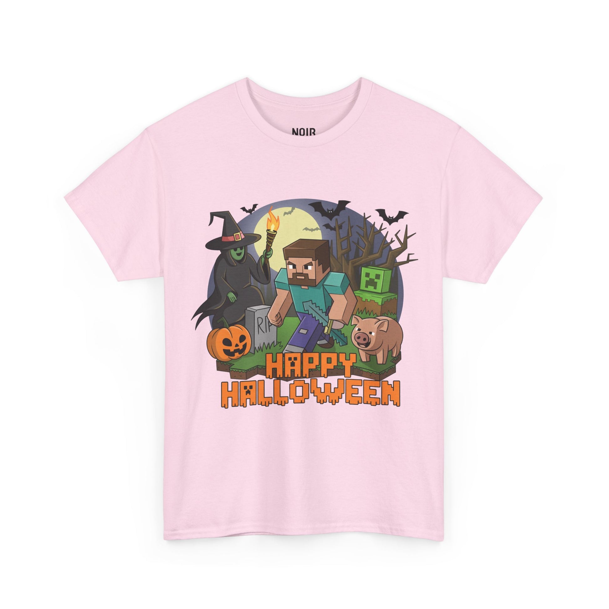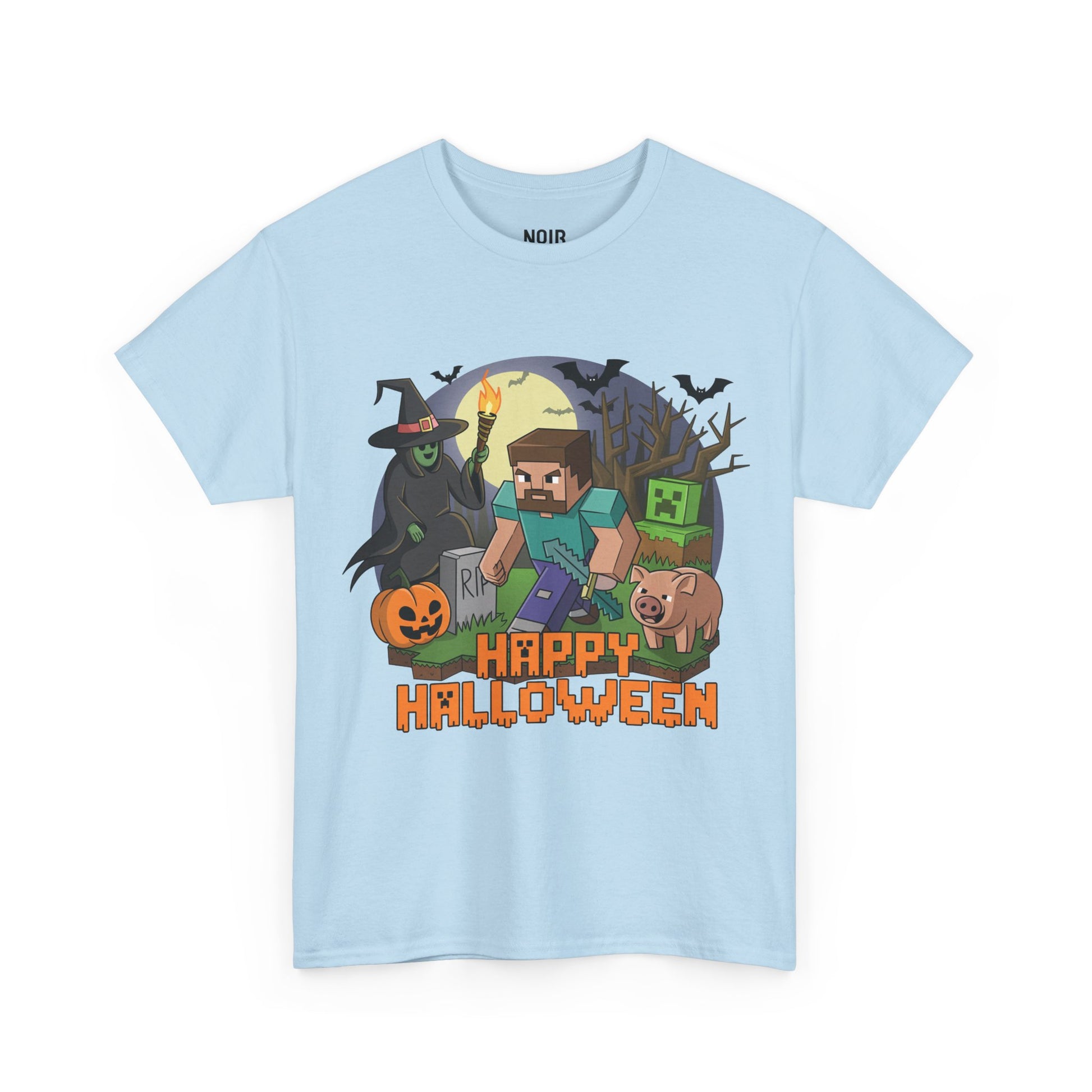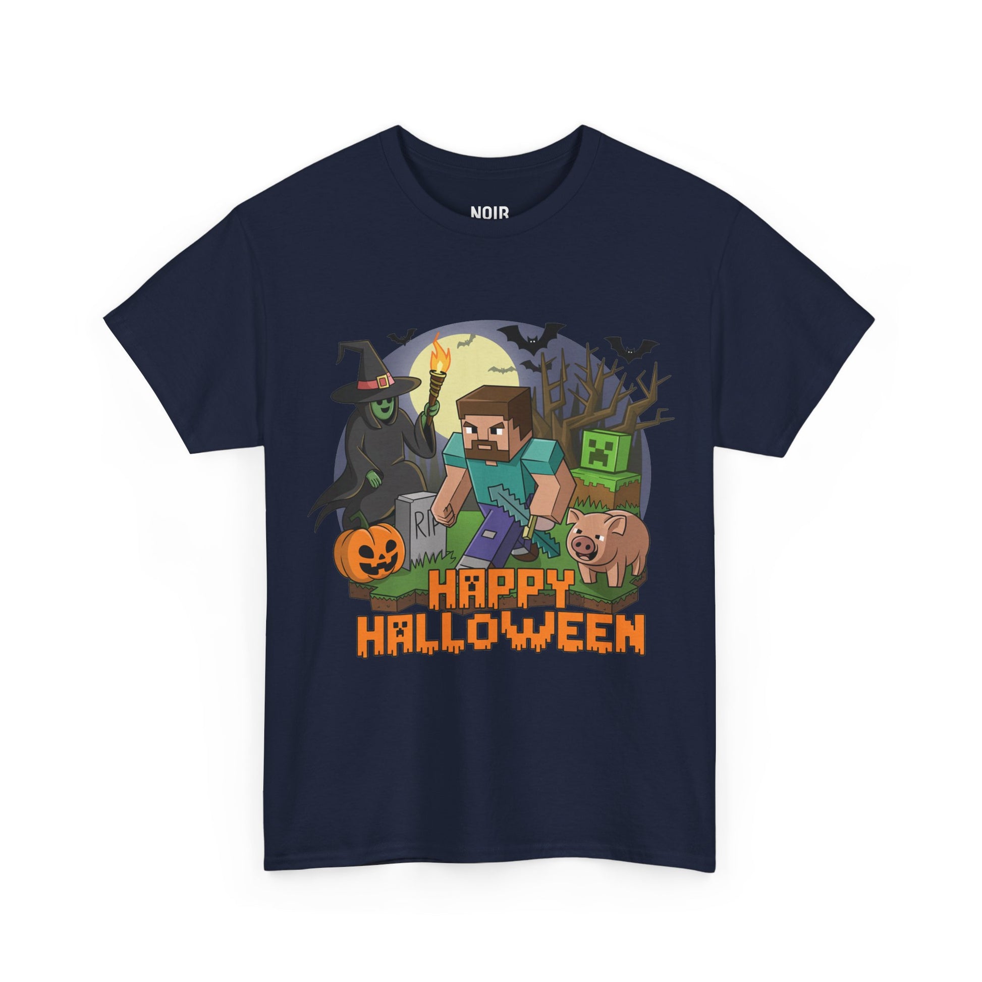 A blocky adventurer sprints through a moonlit graveyard with a torch and pickaxe while a grinning jack-o’-lantern, a cackling witch, bats, a pixel green baddie, and a snorting pig crowd the scene. The chunky HAPPY HALLOWEEN title lands like an old arcade splash screen. The vibe mashes up retro 8-bit game art with classic spooky night tropes square clouds, hard shadows, candy-orange highlights so it feels playful and nostalgic from first wear. It celebrates quest energy and Halloween chaos: grab the loot, dodge the creeps, live to trick or treat another round. Easy to style pair with black or light-wash denim and go.