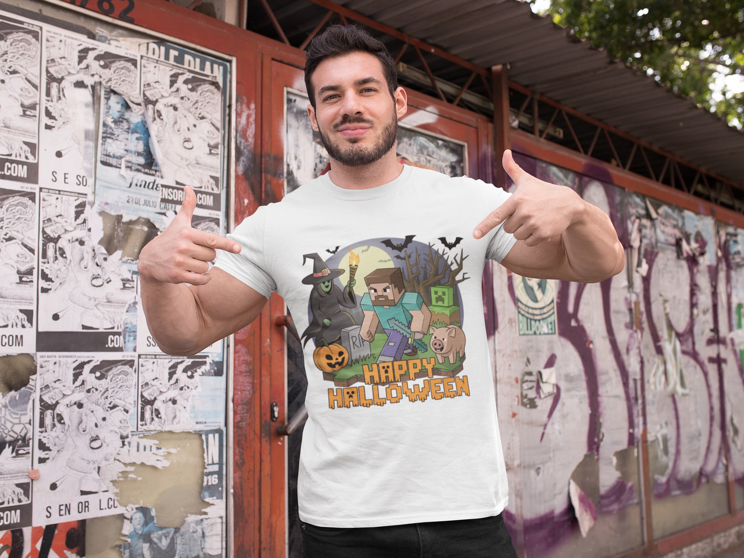 This “Happy Halloween” tee drops a playful pixel-adventure scene blocky hero, witch, moonlit graveyard, fluttering bats, and a grinning jack-o’-lantern for instant festive gamer energy you can throw on any day. Style it easy: black or charcoal jeans, a zip hoodie or open flannel, and white courts or chunky boots; cuff the sleeves once and half tuck the hem to clean up the lines. Perfect for game nights, school spirit days, theme-park runs, costume lite parties, movie marathons, and trick or treat strolls. Go true to size for a neat drape, or size up for an oversized, couch co-op fit.