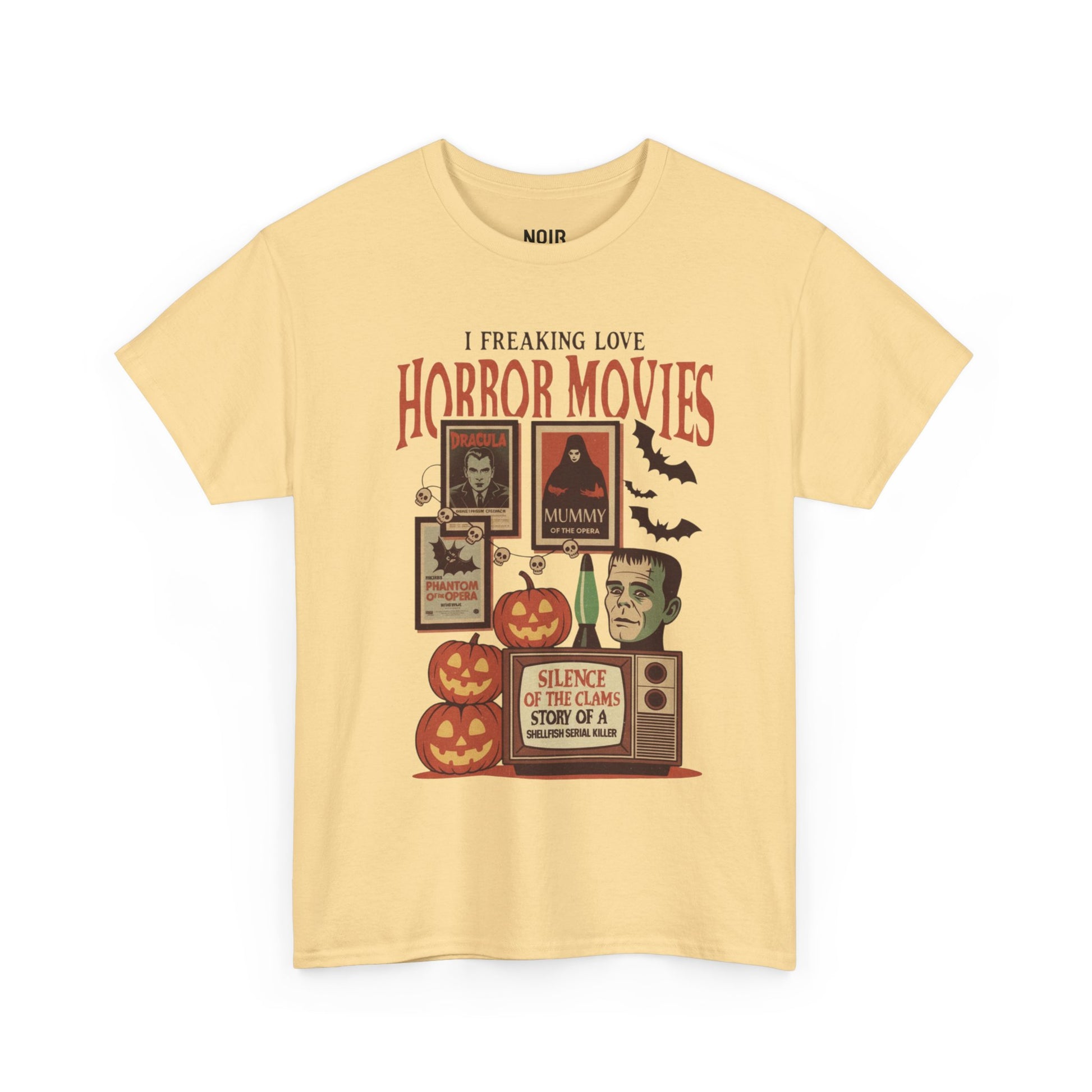 Hand-lettered HORROR MOVIES towers over a collage of classic monster posters, a stack of grinning jack-o’-lanterns, fluttering bats, a retro TV, and a deadpan creature cameo plus the cheeky marquee “Silence of the Clams” for a wink. The vibe pulls from drive-in marathons, VHS rental aisles, and midnight double features: faded inks, pulp textures, and that late night glow you remember from staying up too late. It celebrates camp and chills in equal measure fans who know the lines, love the jump scares, and laugh at the bad ones. Built for everyday rotation; pair with black denim and call it your year round spooky uniform.