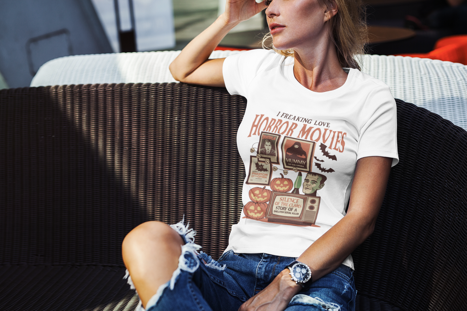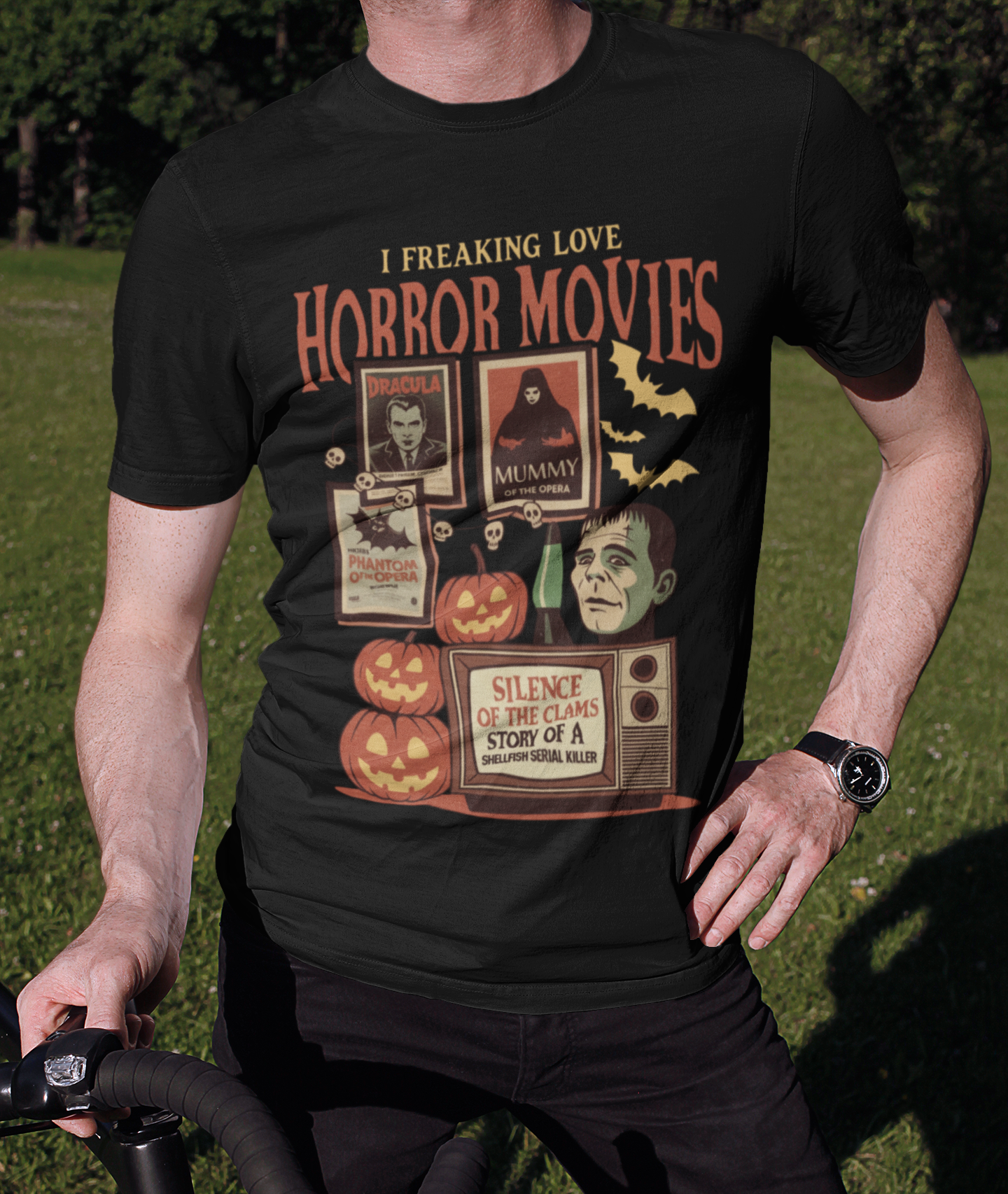 Soft, breathable, and unapologetically spooky the “I Freaking Love Horror Movies” tee stacks classic monster posters, jack-o’-lanterns, and a retro TV for instant cinephile cred. Style it watch-party casual: black jeans, a charcoal hoodie or open flannel, white court sneakers or combat boots; finish with a beanie or snapback. Perfect for movie marathons, Halloween nights, trivia bars, conventions, theme-park runs, and any laid-back day you want your fandom on display. True to size for a clean drape; size up for an oversized, cozy binge-watch fit.
