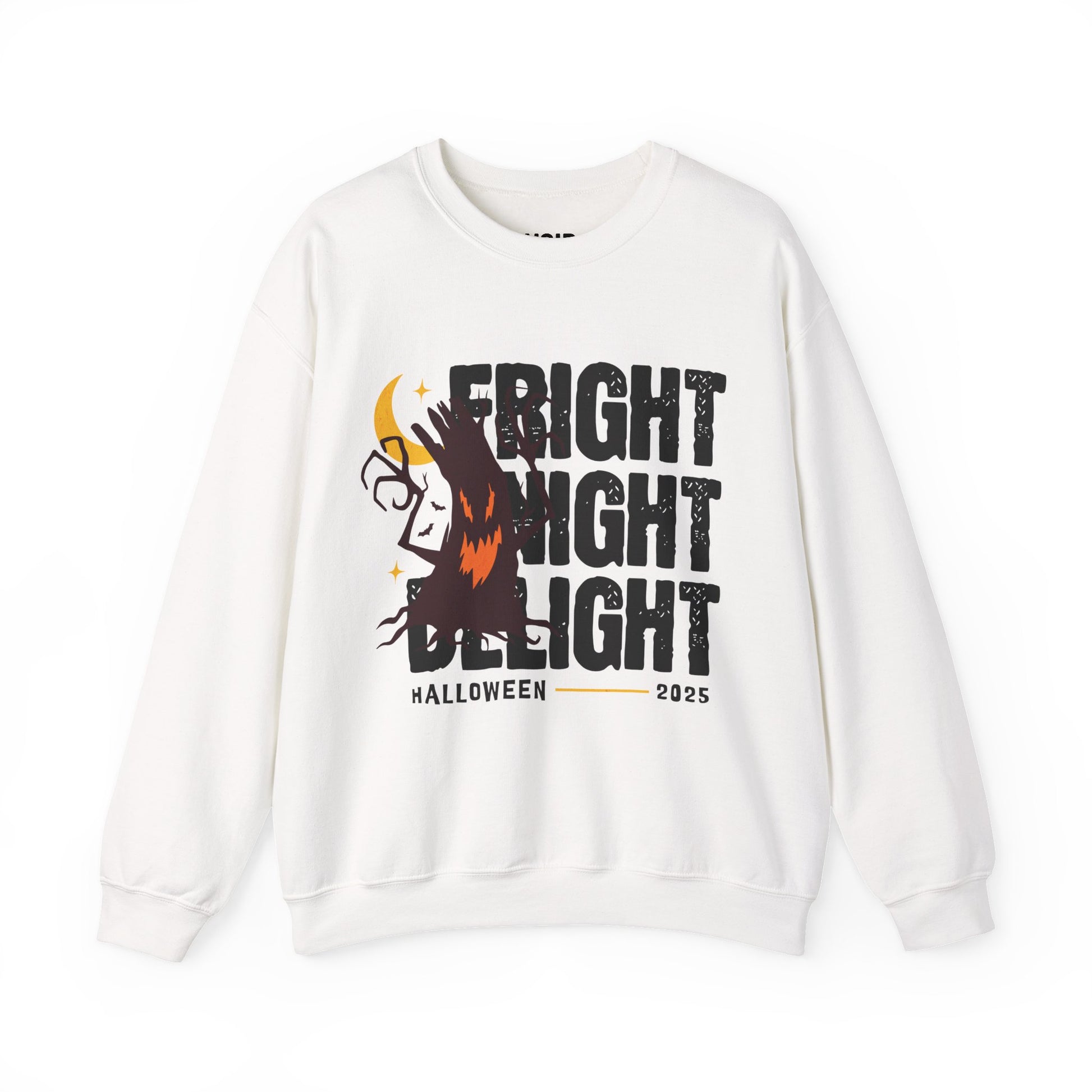 Stacked, distressed block letters shout FRIGHT / NIGHT / DELIGHT like a wall of midnight posters, slashed by a haunted tree lunging across the type gnarled branches, glowing jack-o’-trunk grin, restless eyes. A crescent moon and star flecks lock it to Halloween 2025, with rough ink grain so it feels hand-pulled and already broken in. It’s drive-in horror meets street-paste graphic: loud, playful, a little unhinged. Celebrates the fun side of fear jump scare laughs, candy-fueled courage, ghost stories on the way home. Cozy fleece made for daily rotation; throw it on with black denim or a flannel and you’re set for spooky season.