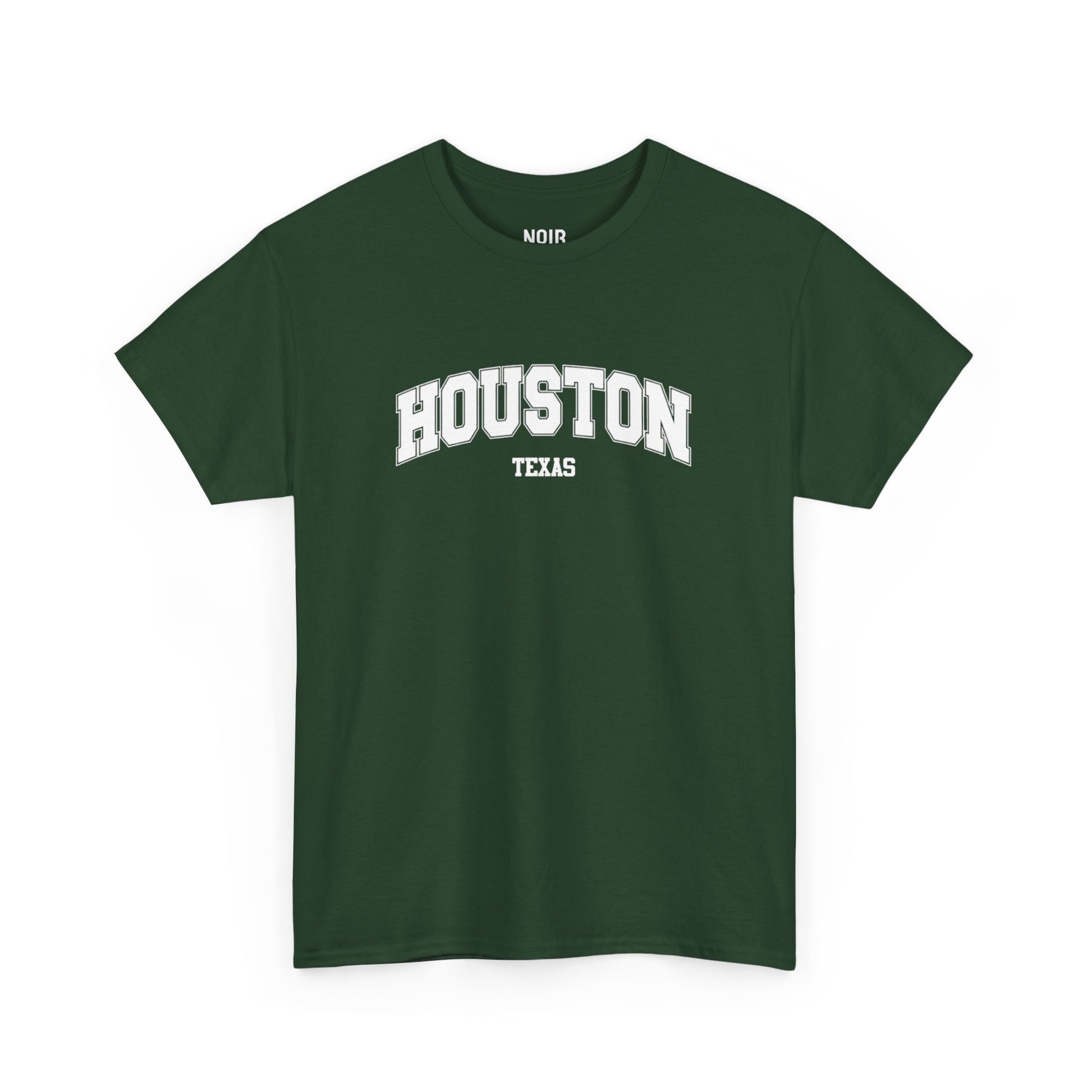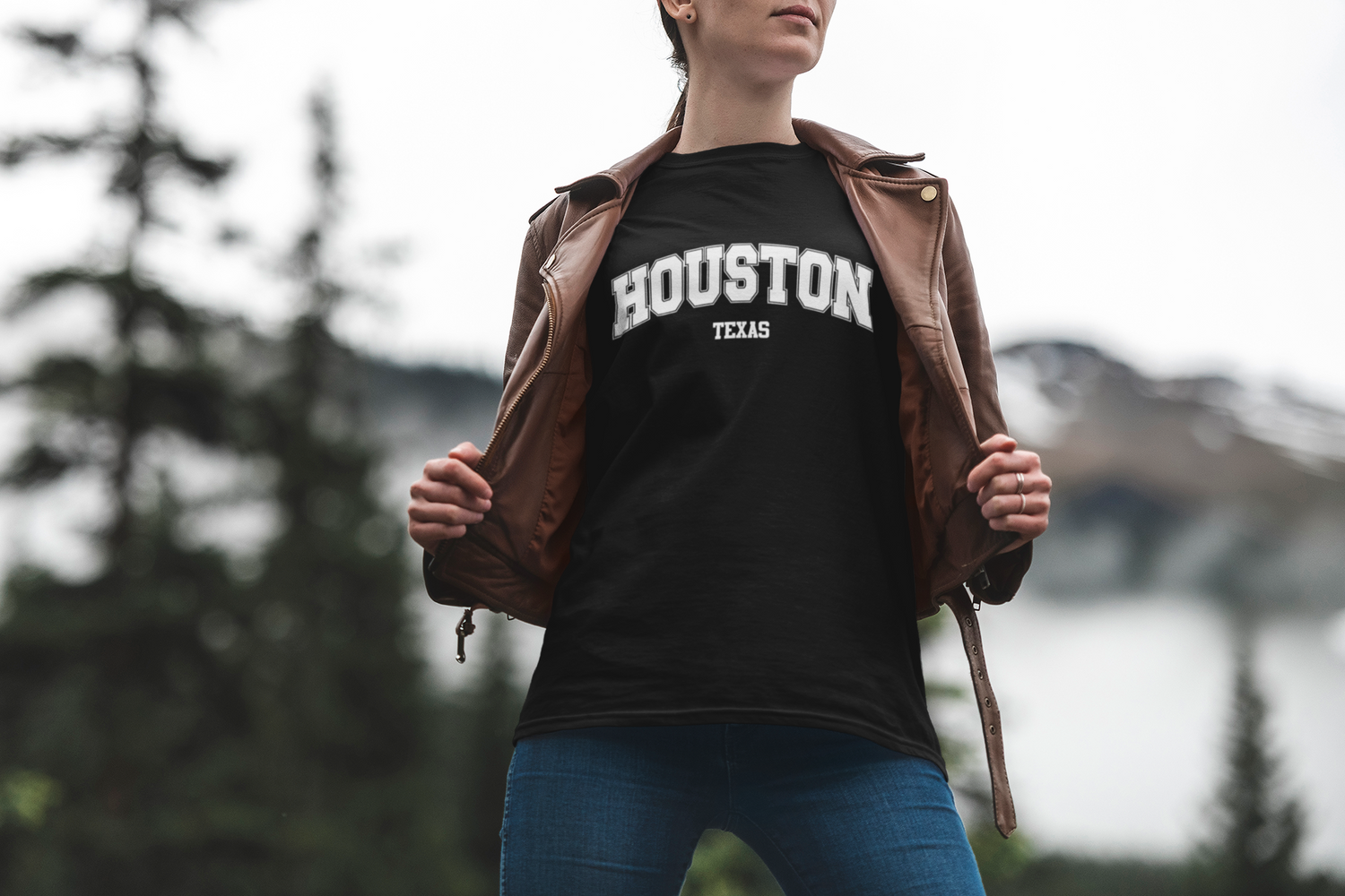 A crisp varsity arch spells HOUSTON with a subtle double outline, anchored by a compact TEXAS tag. Inspired by Astrodome-era athletic lettering, NASA mission patches, and Friday-night lights, it mixes Space City ambition with Bayou City ease. It represents hustle, warmth, and big-energy optimism. Built for everyday wear—throw it on with denim for a clean, go-anywhere look.