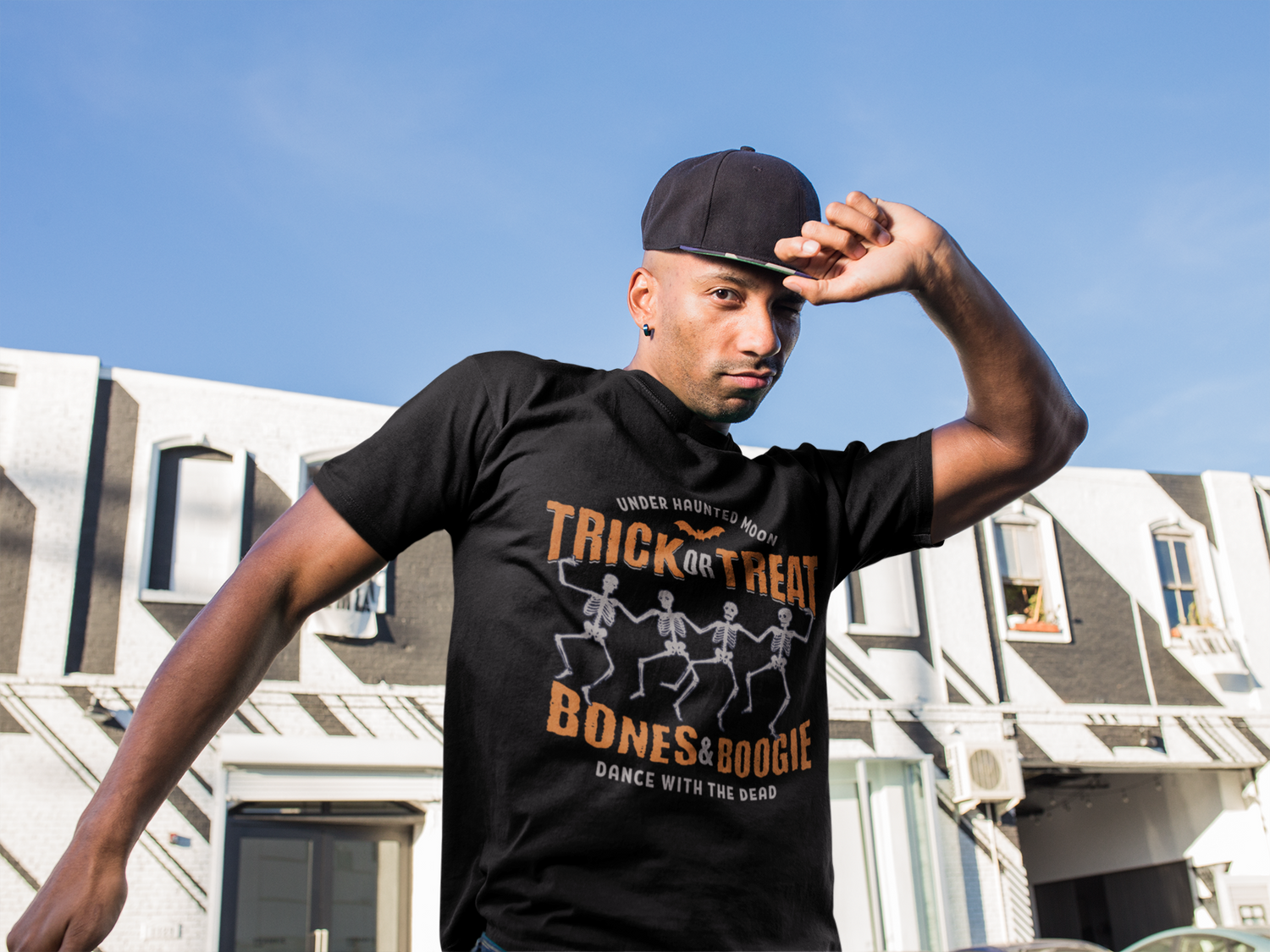 The “Trick or Treat – Bones & Boogie” tee lines up four dancing skeletons under big carnival lettering for instant Halloween fun you can wear all month; throw it on with black straight jeans or charcoal cargos, white courts or combat boots, and an open denim or plaid shirt for easy rhythm, then add a beanie or chain to dial the attitude. It’s a guaranteed crowd pleaser for pumpkin patches, bar trivia, concerts, haunted house runs, theme park nights, school spirit days, and any costume-lite party where you want festive without full cosplay. Go true to size for a clean drape that hits at the waistband, or size up for a relaxed, boxy vibe that layers smoothly; wash inside out on cold and dry low to keep those bone-dads dancing crisp.