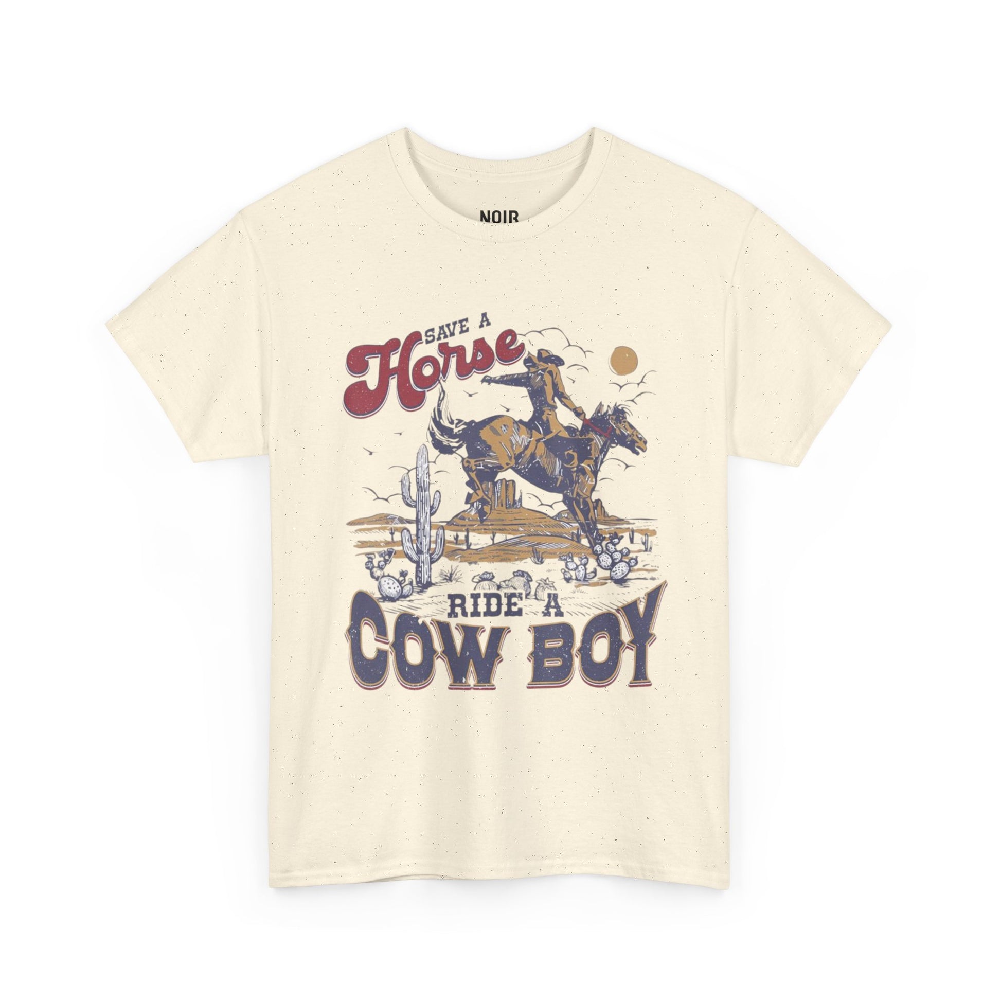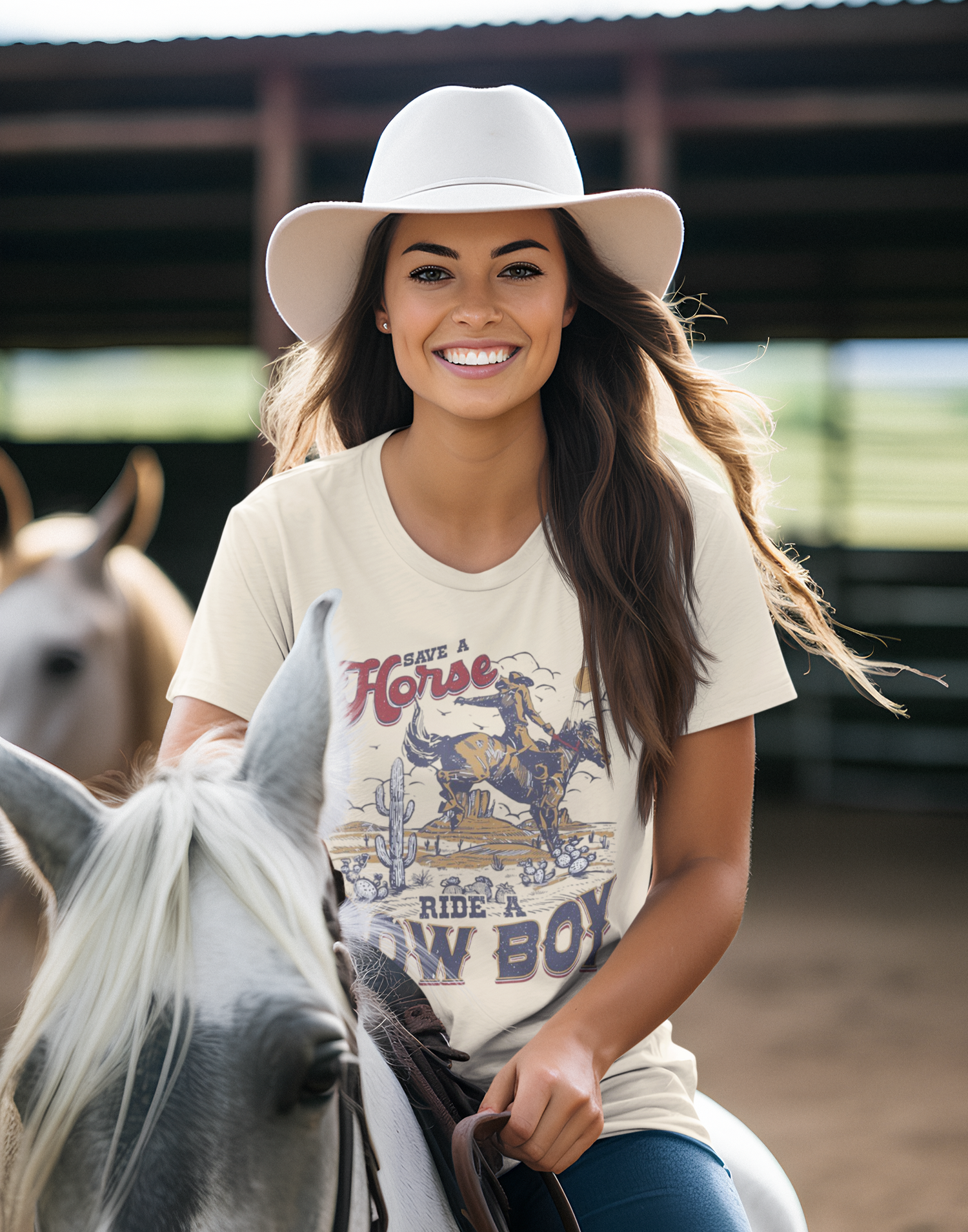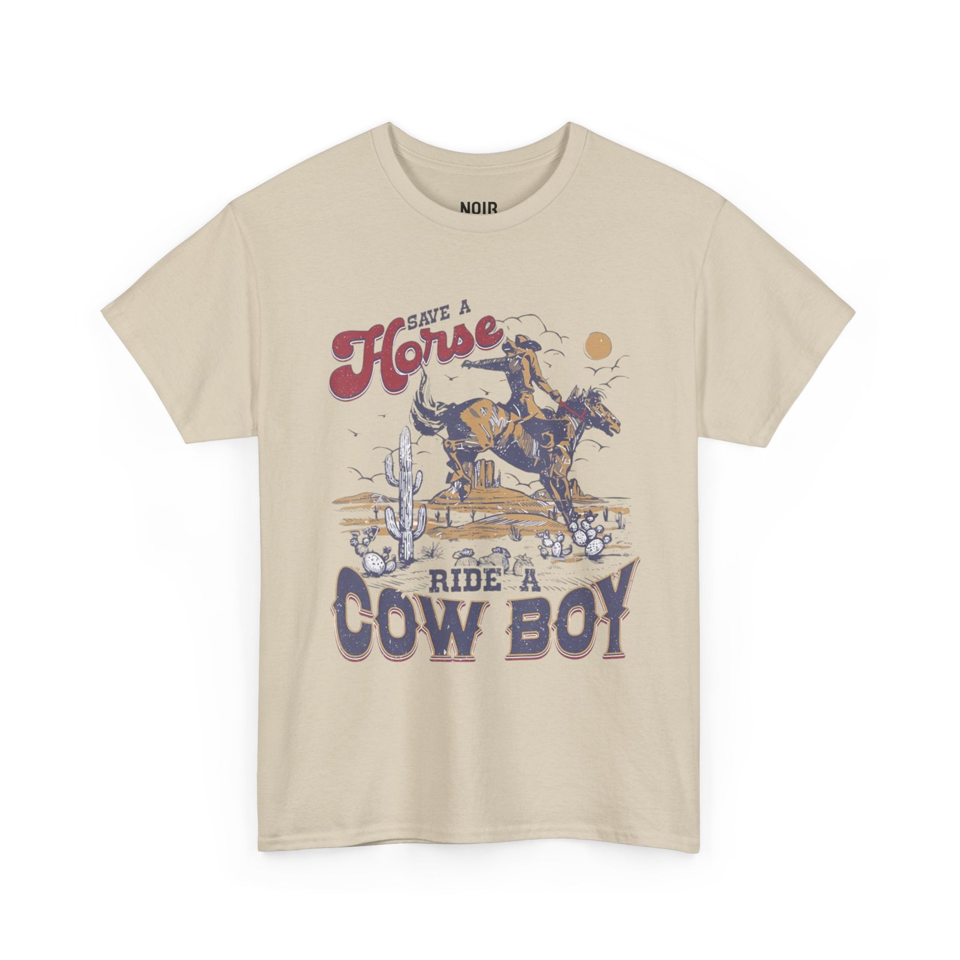 Cherry-red script wraps the line Save a Horse while a bronc rider blasts across a desert scene cactus, scrub, and a small burnt-gold sun before landing on the big, blocky punchline RIDE A COWBOY. The artwork keeps a hand-inked, halftone feel with slightly off-register fills, like a rodeo poster pulled from a barroom wall after last call. We pulled cues from mid-century rodeo bills, honky-tonk matchbooks, and roadside postcards the kind that smell like dust and jukebox quarters. It’s cheeky on purpose: a wink to country anthems and dance-floor dares, where grit meets charm and the night might get interesting.