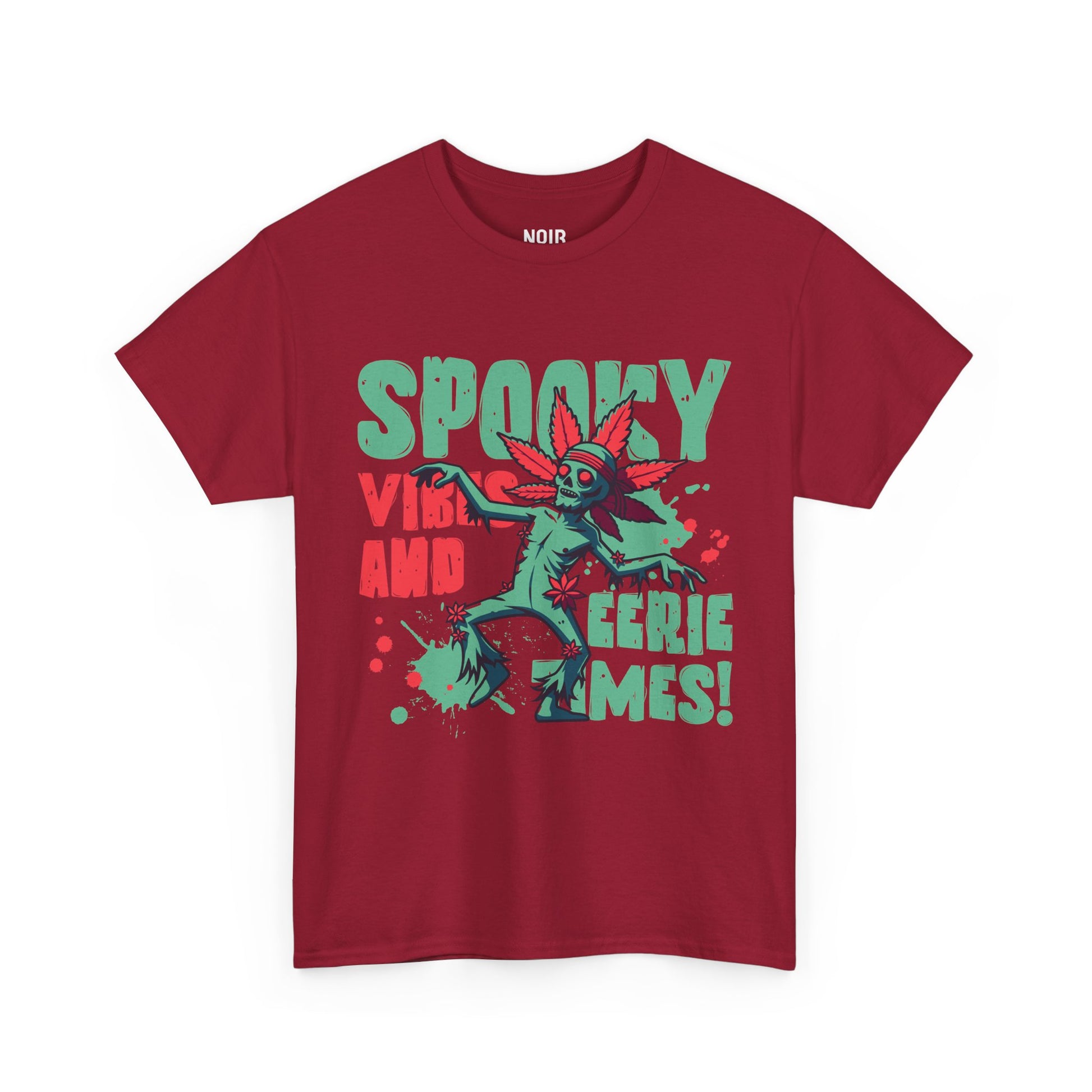 Big block letters shout SPOOKY VIBES AND EERIE TIMES! while a wiry forest trickster lurches through splashes of mint green and candy red. The character’s skull mask, leaf-crown, and twiggy limbs feel like folklore come to life half scarecrow, half woodland spirit drawn with bold inks and splatter textures that read like a hand-painted festival poster. It’s playful-creepy rather than gory: street-art energy, cartoon mischief, and just enough chaos to turn heads. Built for everyday wear throw it on with black denim or cargo shorts and let the vibes do the haunting.