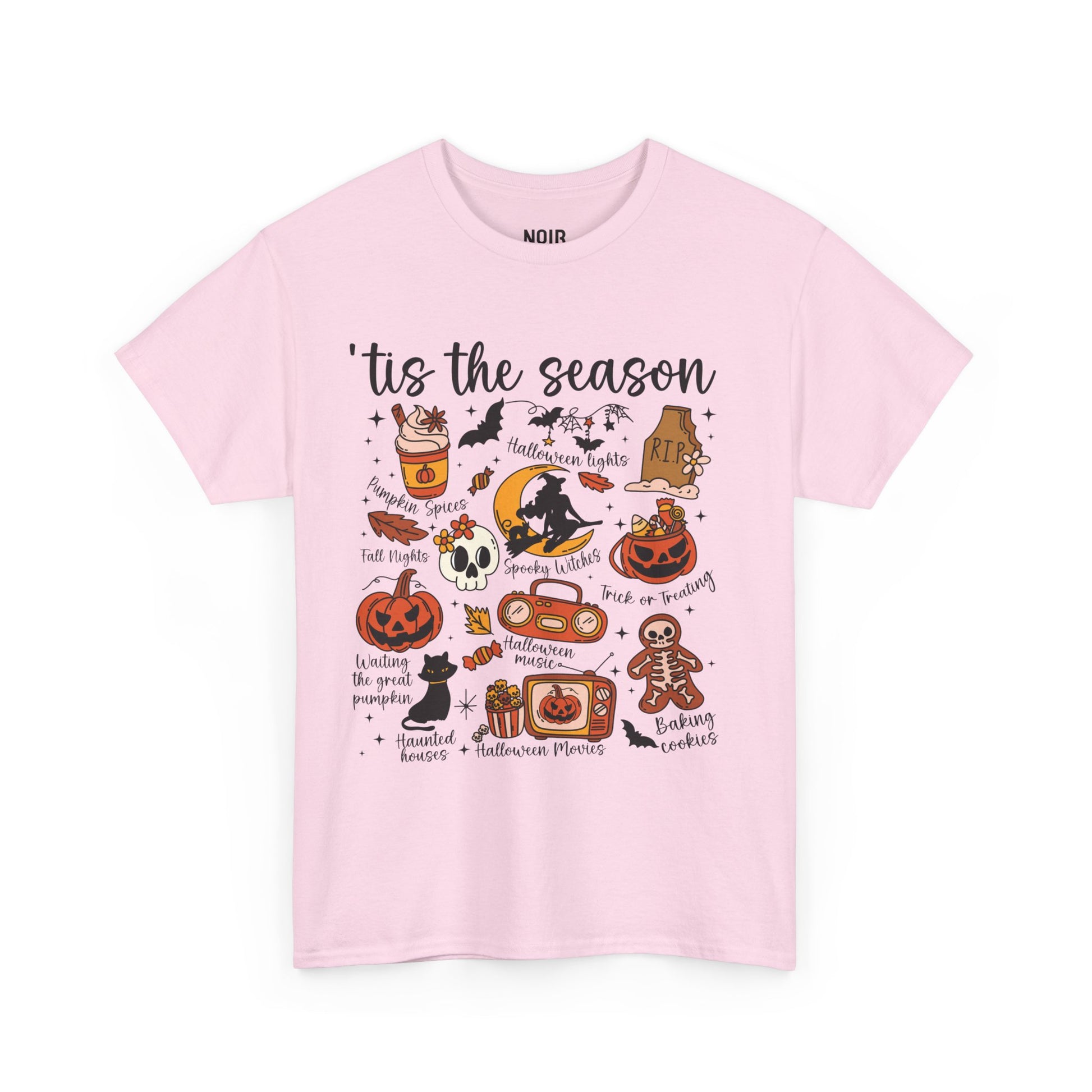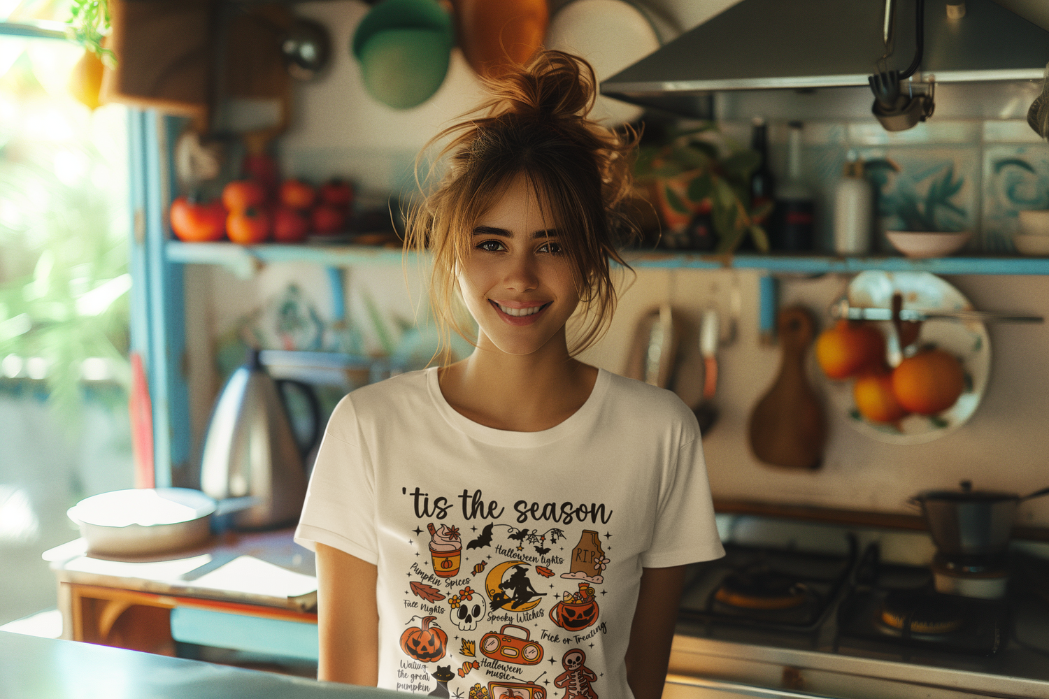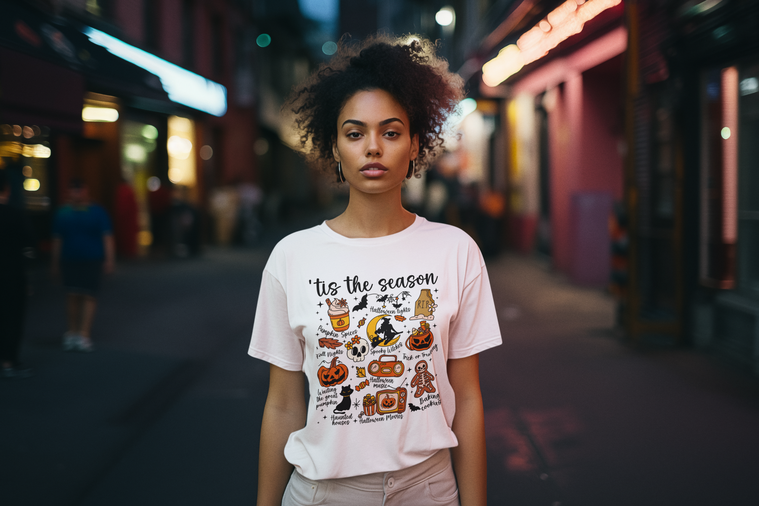 The “‘tis the season” tee scatters all the cozy halloween essentials pumpkin spice, witch hats, spooky radios, bats, and candy into a playful grid that reads festive at a glance. Pair it with black or charcoal denim, an orange plaid or denim jacket left open, and white courts or chunky boots; a quick sleeve cuff and half tuck keep the silhouette tidy. It’s the easy win for pumpkin patch trips, movie marathons, classroom spirit days, trick or treat strolls, theme park runs, bake nights, and any casual plan where you want cheerful fall vibes without a full costume. True to size for a neat drape; size up for a cozy, layered fit.