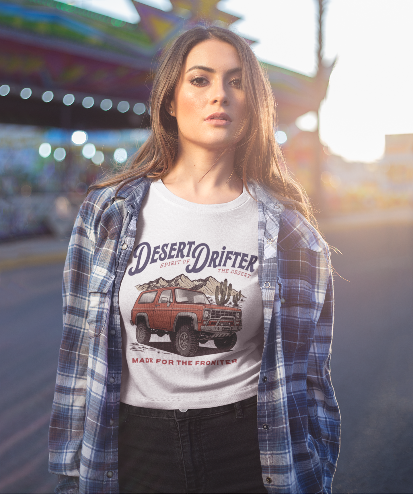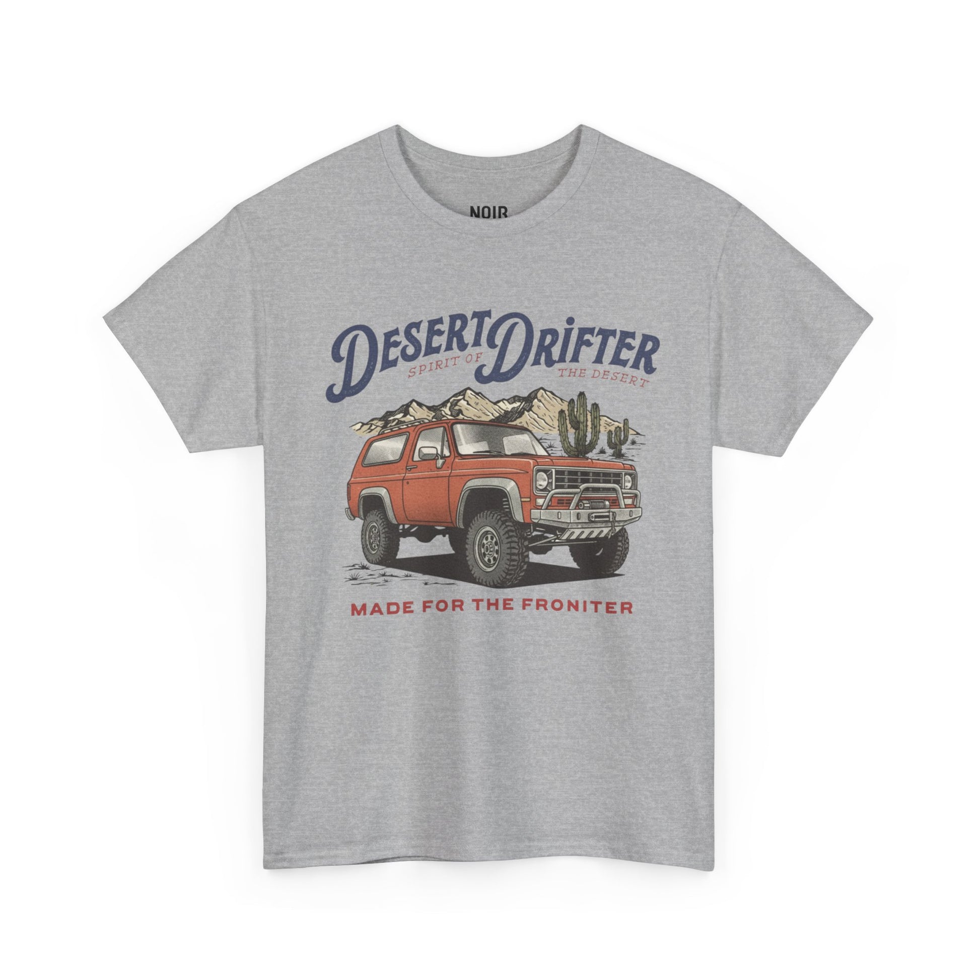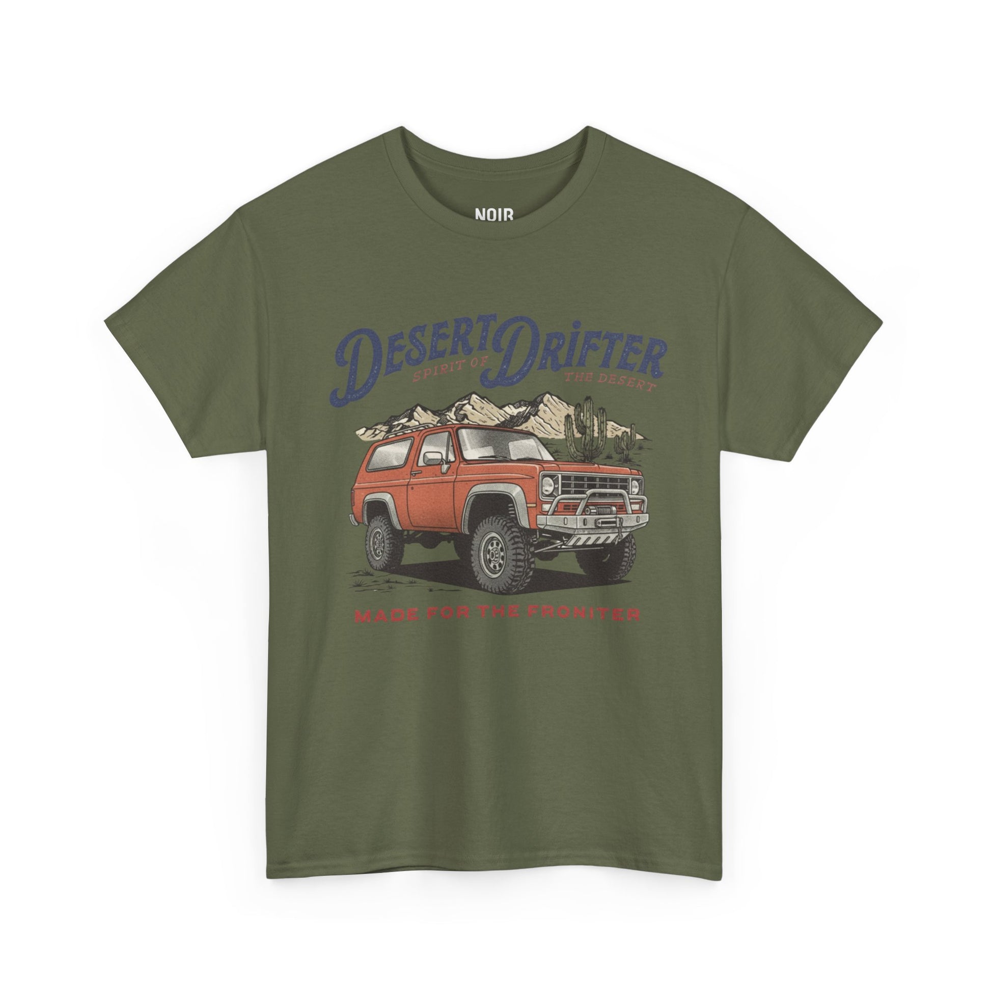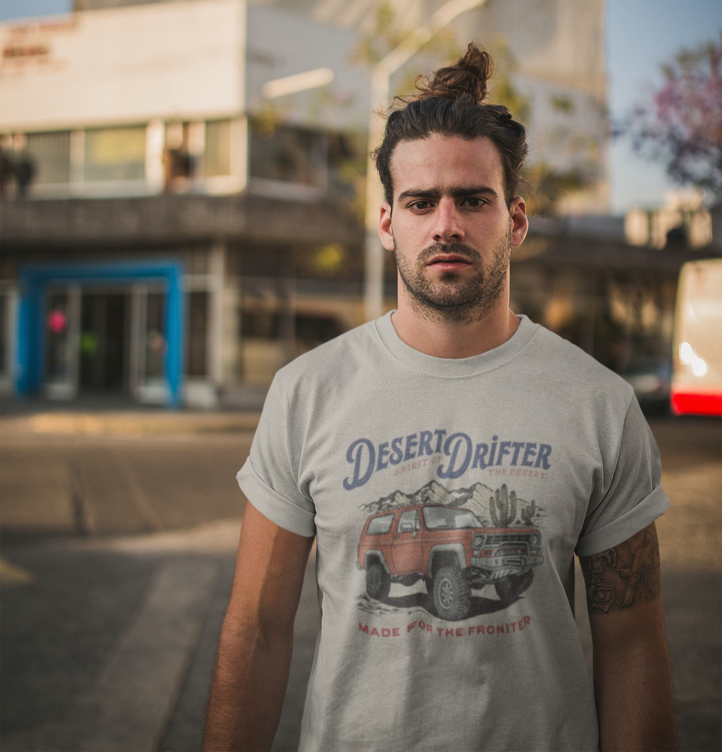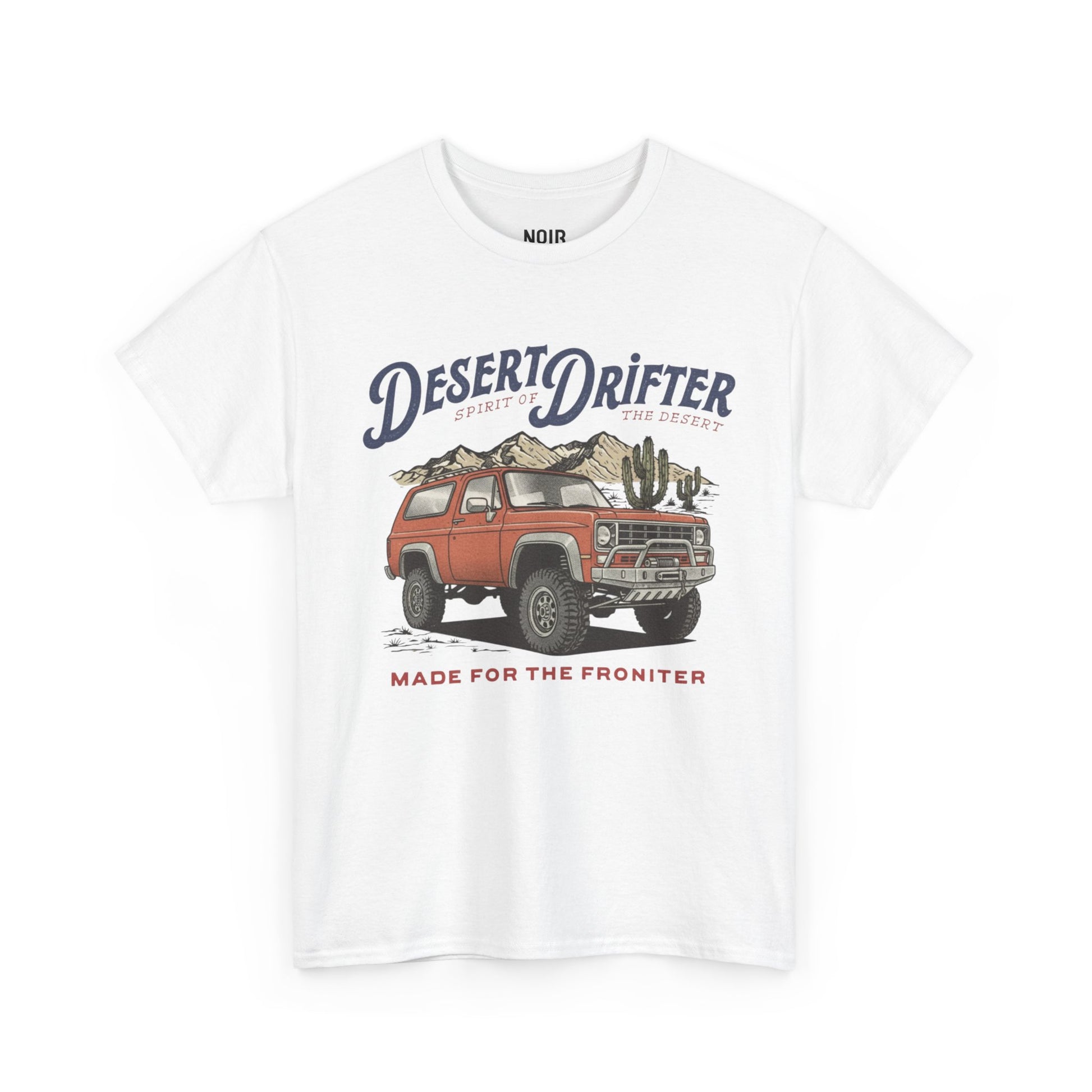 Navy script Desert Drifter rides over a sun baked off-roader easing past saguaros with low mountains on the horizon, stamped Spirit of the Desert and Made for the Frontier. The artwork pulls from overland patches, gas-station postcards, and sun-faded service manuals gritty linework, baked-clay reds, and a touch of road grime that feels one fuel stop from nowhere. It’s about wanderlust and self-reliance: fix it, point it toward the open, and keep rolling. Built for everyday rotation team it with light-wash denim or canvas shorts and go.