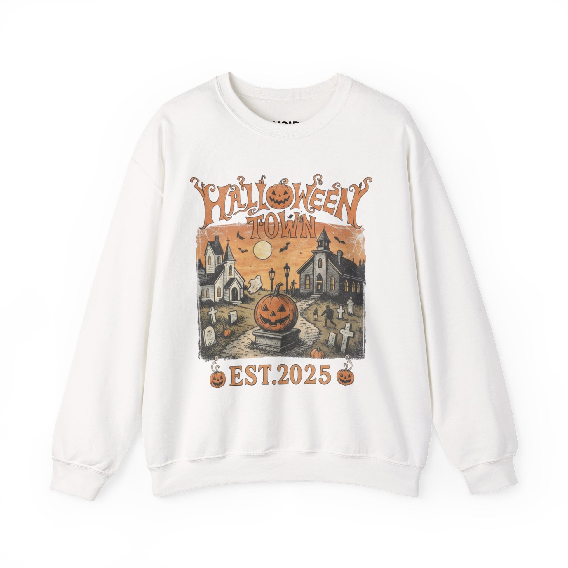 The “Halloweentown – EST. 2025” crewneck splashes a storybook graveyard gothic chapels, cobweb skies, and a grinning jack-o’-lantern so you’re October-ready the second you pull it on, while plush fleece keeps you warm for crisp nights. Style it fall casual with black or charcoal denim, white courts or combat boots, and an orange black flannel or denim jacket left open; let a white tee peek at the hem and give the cuffs one roll to tidy the lines. Perfect for pumpkin patches, horror marathons, haunted house runs, office spirit weeks, theme park days, and lowkey parties where you want festive without a full costume. Choose your usual size for a clean drape, or size up for a cozy, layered fit; wash inside out on cold to keep the graphic sharp.