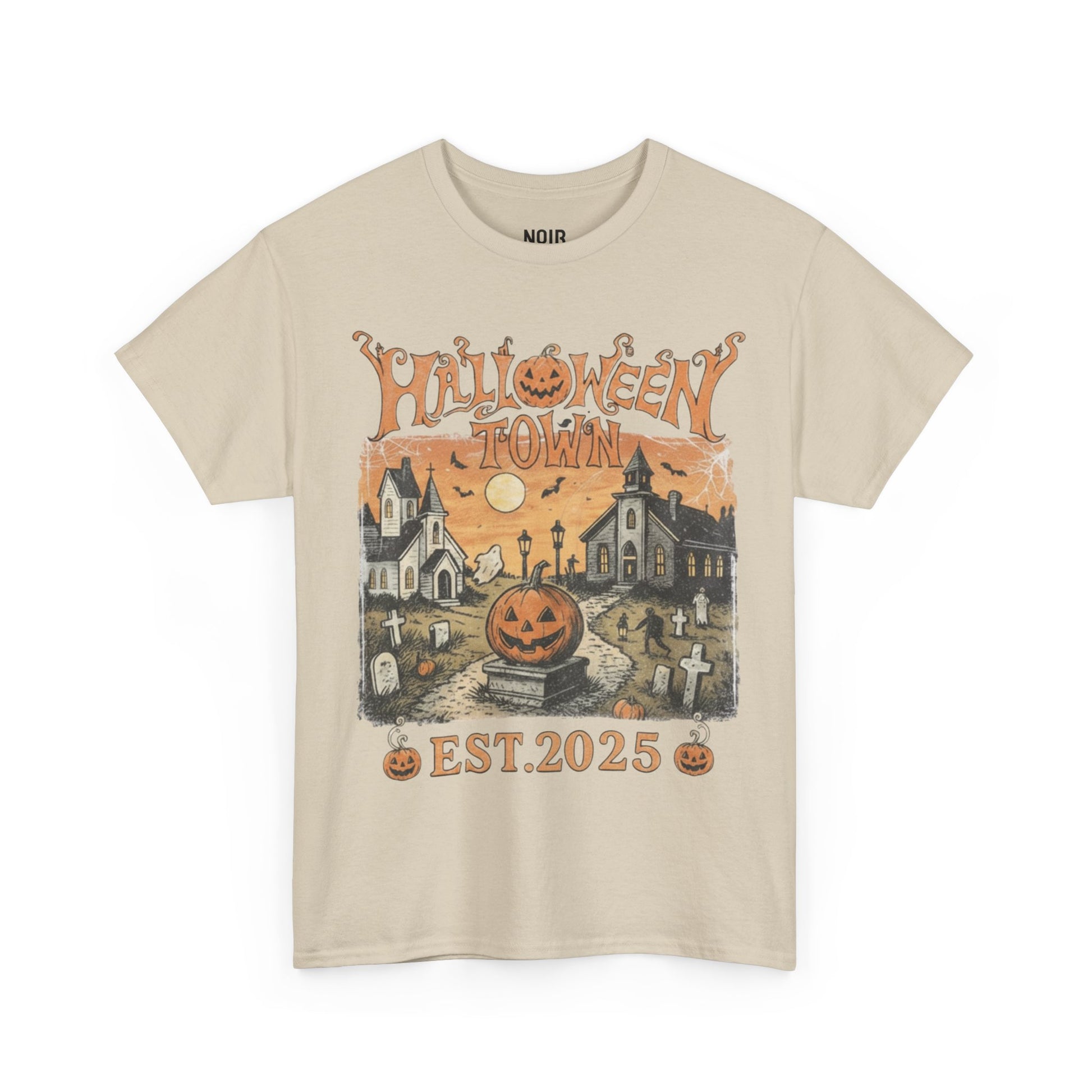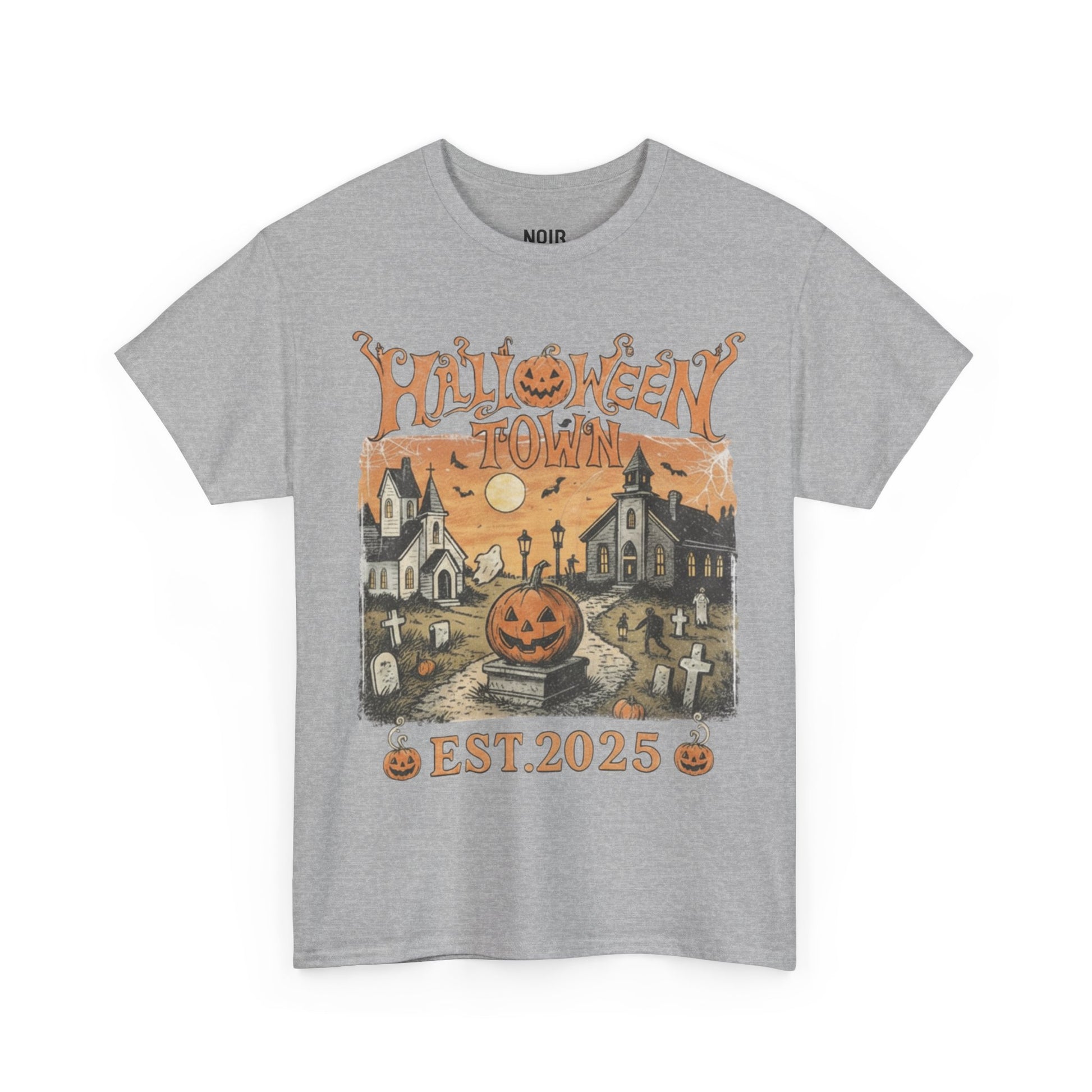 Curling pumpkin letters crown a twilight graveyard scene twin chapels, crooked headstones, cobwebs in the corners, and a jack-o’-lantern perched on a stone plinth grinning down the path. A pale moon hangs over an orange sky while streetlamps flicker on, sealing it with EST. 2025. The illustration borrows from vintage storybook etchings and old Halloween postcards charcoal strokes, harvest orange, candle-glow yellows so it feels like crisp fall air the first time you wear it. It celebrates cozy spooky nostalgia: leaf crunch nights, windowlight, and small town chills with a smile. Easy to style pair with black denim for instant autumn vibes.