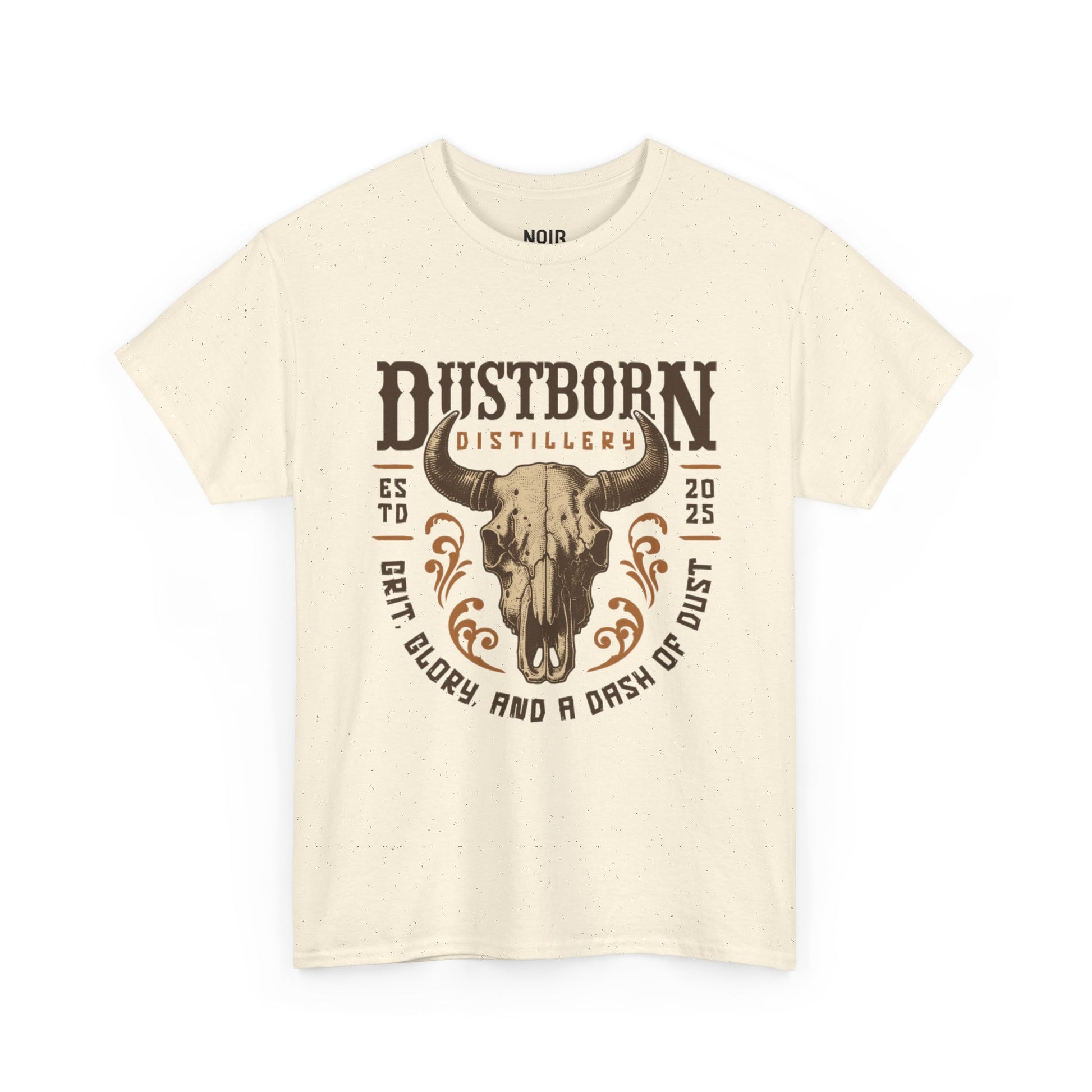 Bone-tan lettering crowns a horned skull, framed by rust-orange flourishes and a roundel that reads “Grit, Glory, and a Dash of Dust,” with ESTD 2025 flanking the mark. Inspired by vintage Western-style whiskey labels, desert roadhouse signage, and sun - bleached cattle skulls, it bottles frontier energy tough, weathered, a little outlaw. It represents hard-won pride and the stories earned on backroads. Built for daily rotation - throw it on with denim for an easy, ready-to-ride look.