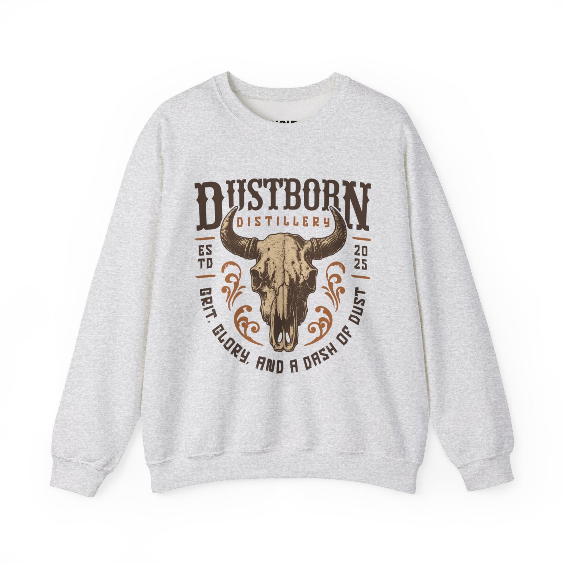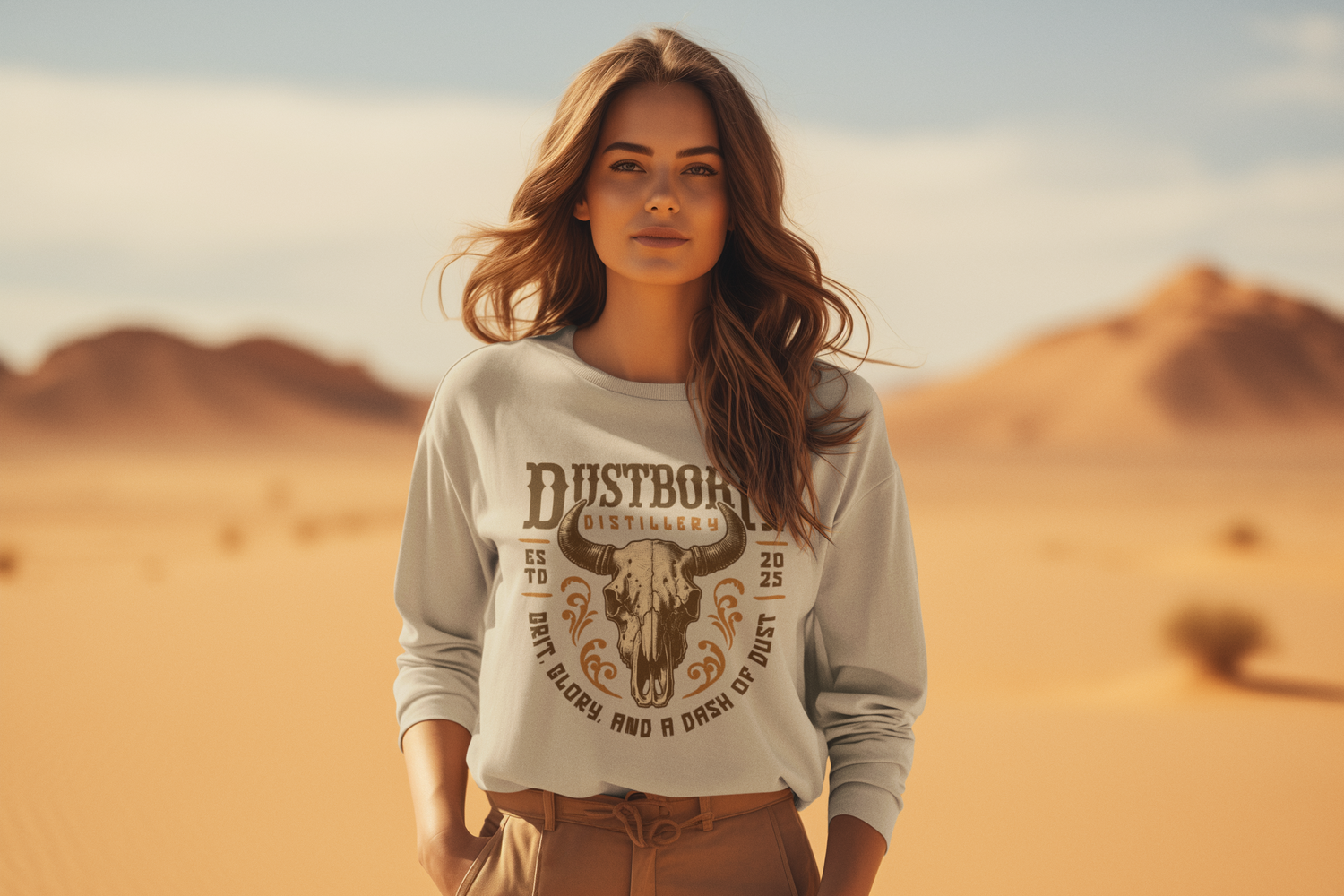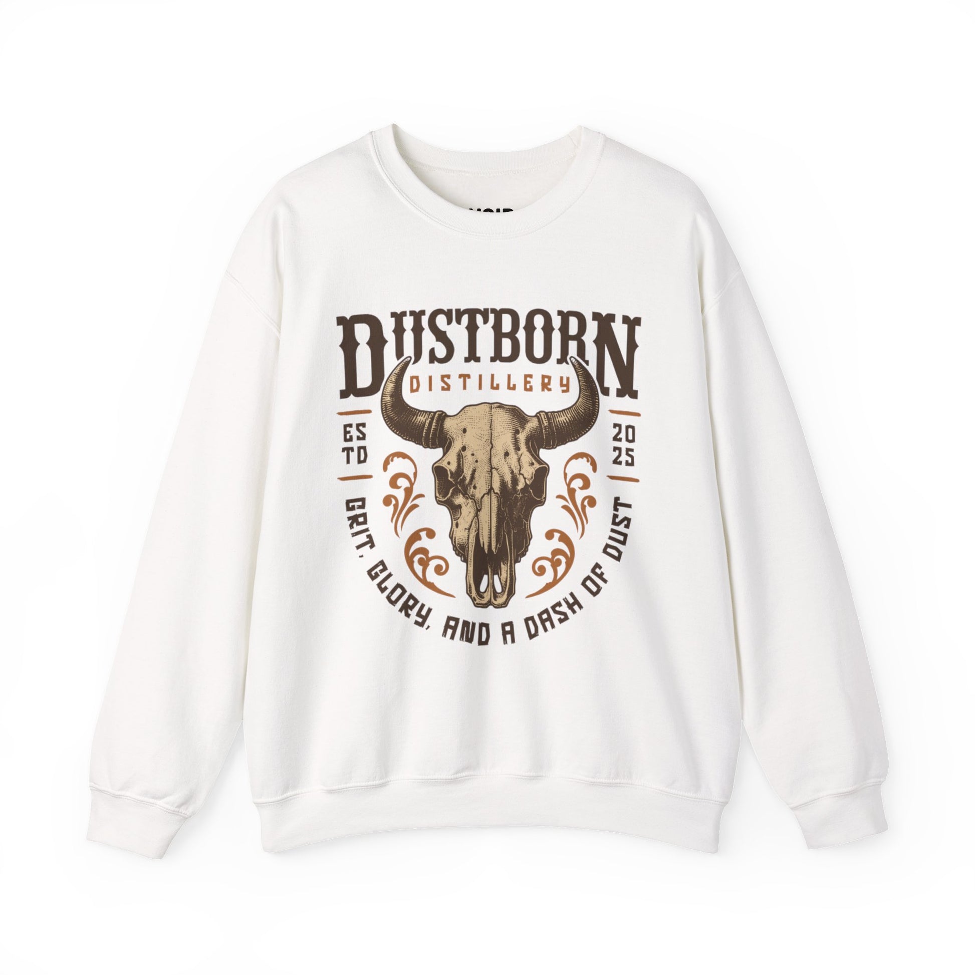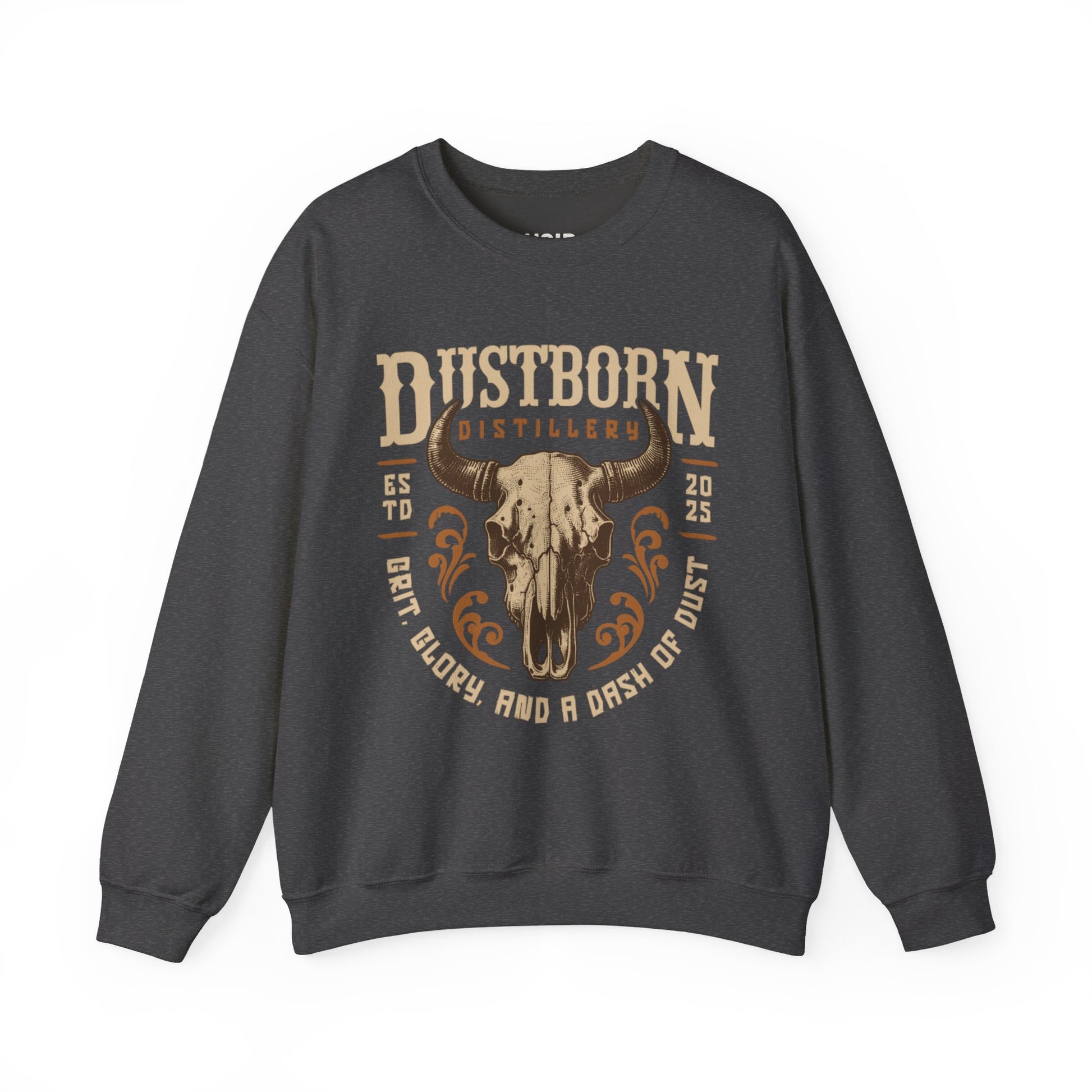 The Dustborn Distillery crewneck pairs plush fleece comfort with vintage Western artwork—longhorn skull, saloon scrolls, and a distillery stamp for an effortless statement. Wear it roadhouse-casual: raw denim, a classic trucker jacket, and tan suede boots; roll the cuffs slightly to sharpen the line. Built for daily rotation commutes, campus, coffee runs and perfect for road trips, live gigs, weekend markets, casual Fridays, BBQs, and low-key nights out. Feel warm, look bold - every time.