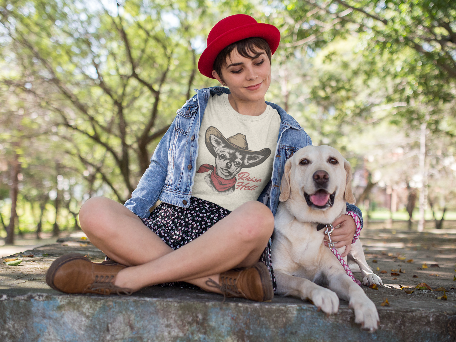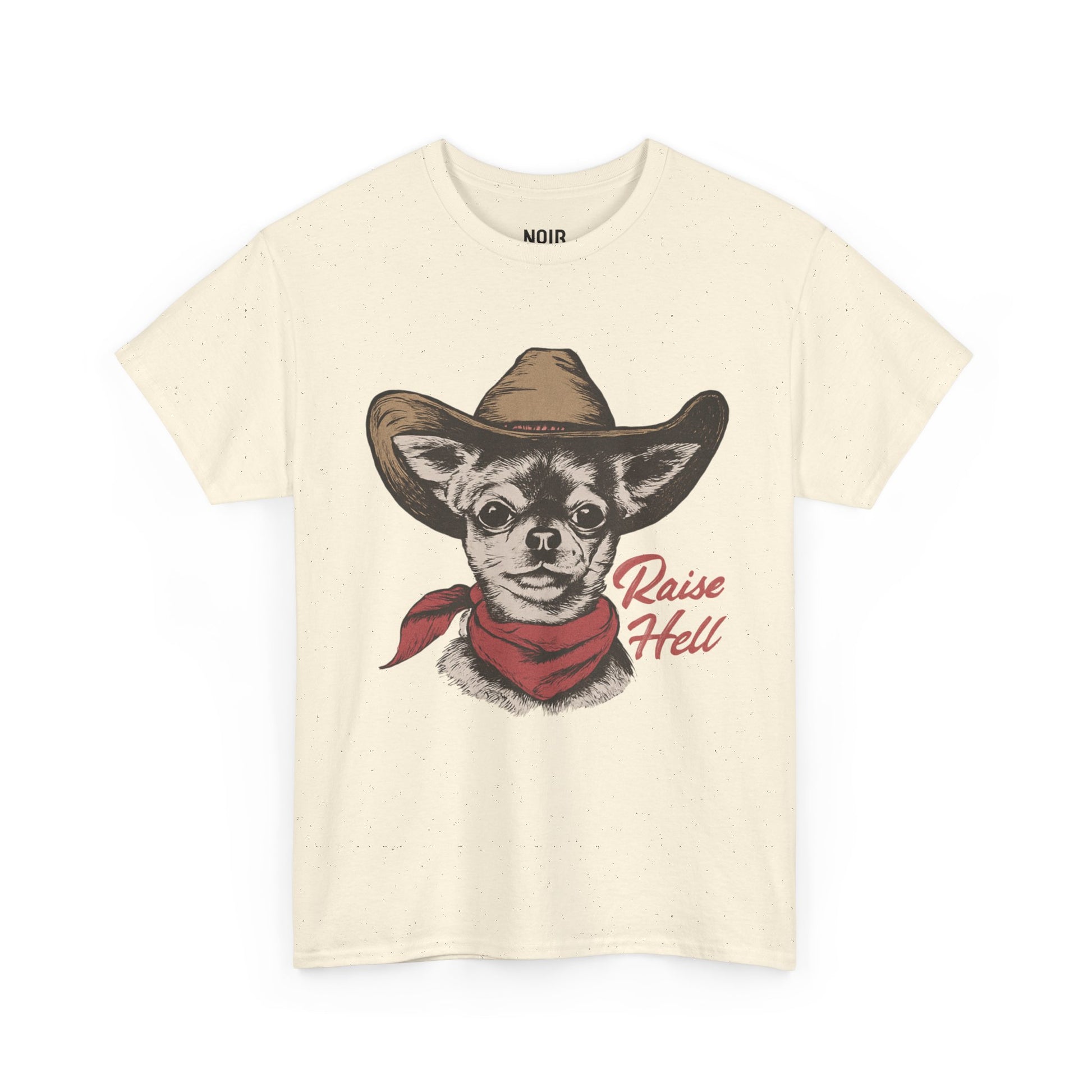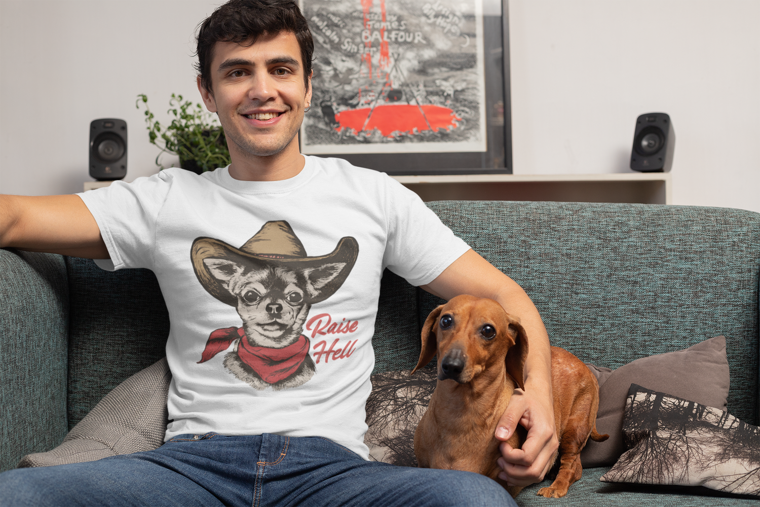 Soft, breathable, and instantly funny - the “Raise Hell” tee puts a cowboy chihuahua front and center for a playful, meme worthy look that breaks the ice anywhere. Wear it fun-casual: light-wash straight jeans, an open denim or plaid shirt, clean white sneakers (or tan suede boots), and a half-tuck; roll the sleeves once and add a red cap or bandana to echo the neckerchief. Your grab-and-go piece for dog-park hangs, brunch runs, coffee dates, game nights, concerts, festivals, road trips, and casual Fridays. True to size for a neat drape; size up for an oversized street fit. Easy to wear, guaranteed compliments.