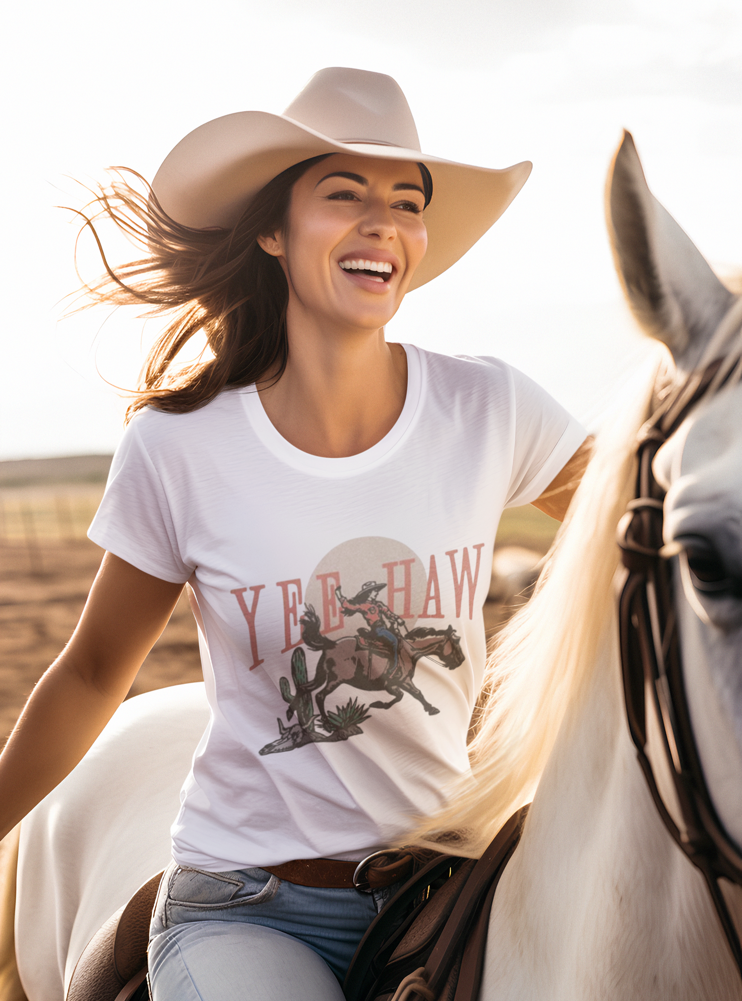 The “Yee Haw” tee pairs soft, breathable comfort with vintage rodeo artwork bucking bronco under a desert sun for a playful, go-anywhere statement. Your grab-and-go staple easy for early starts, long afternoons, and everything in between. Wear it honky-tonk casual: light-wash straight jeans, a denim jacket thrown open, and suede boots or clean white sneakers; a single sleeve roll sharpens the line. Great for concerts, festivals, road trips, farmers’ markets, backyard BBQs, and casual Fridays. Feel easy, look lively - every time.