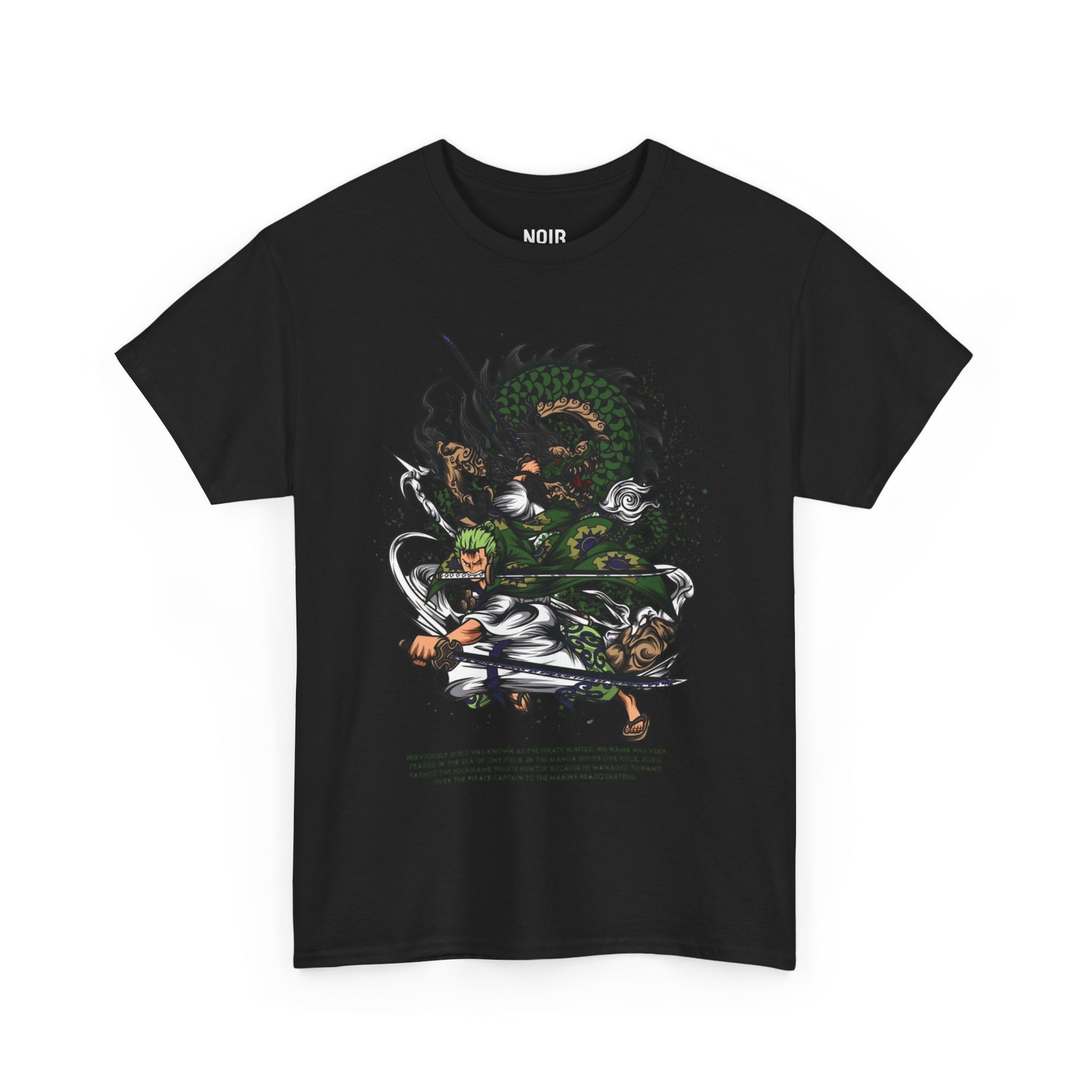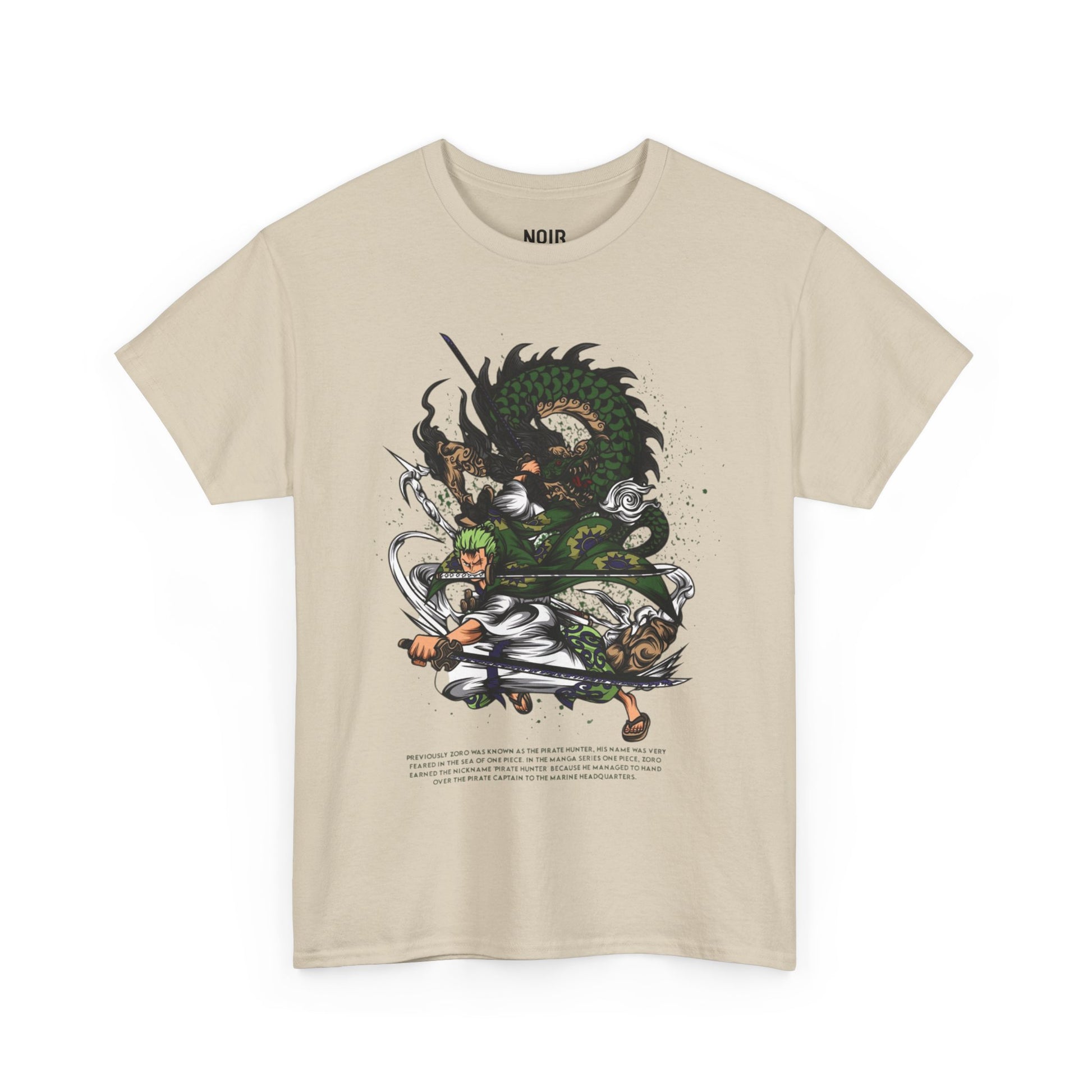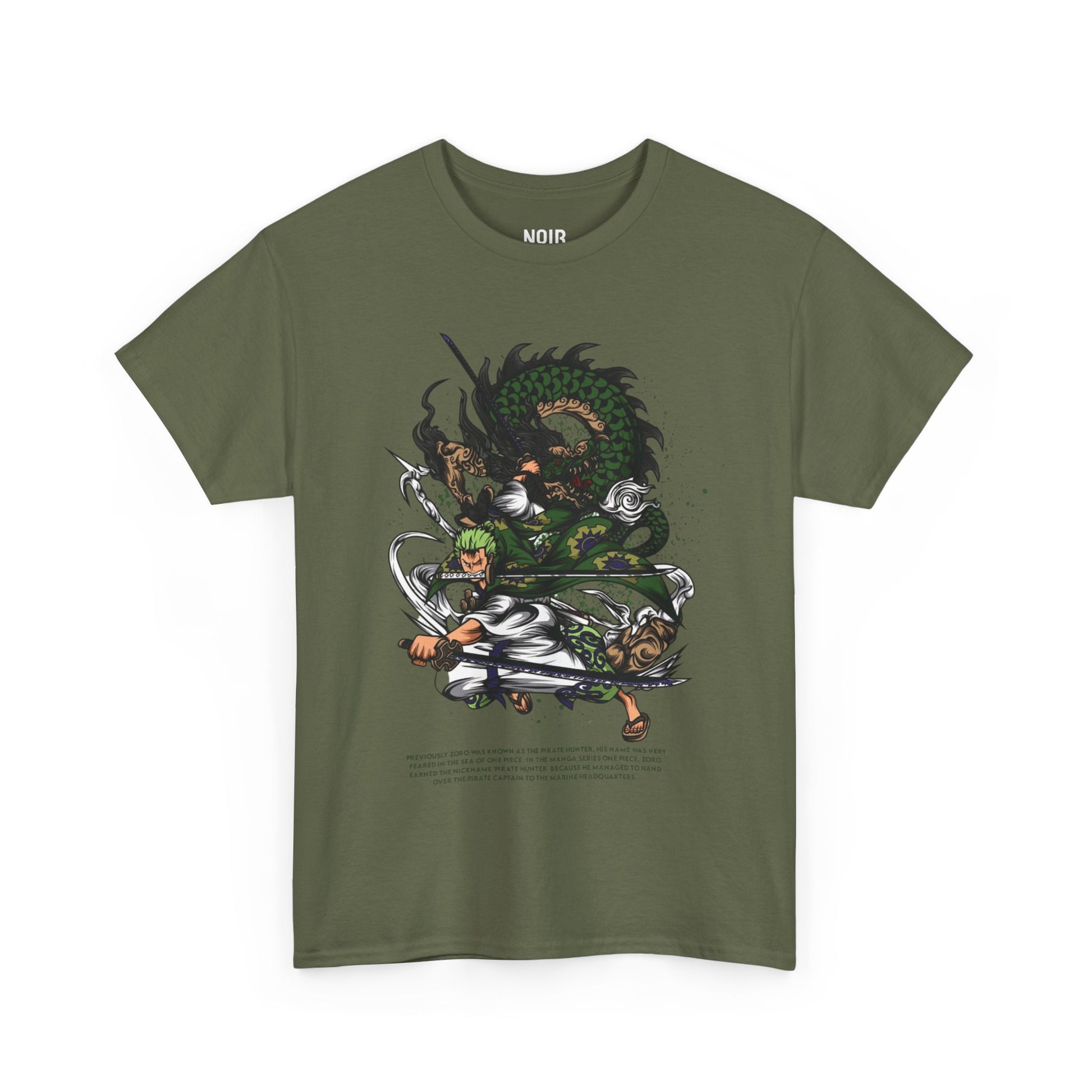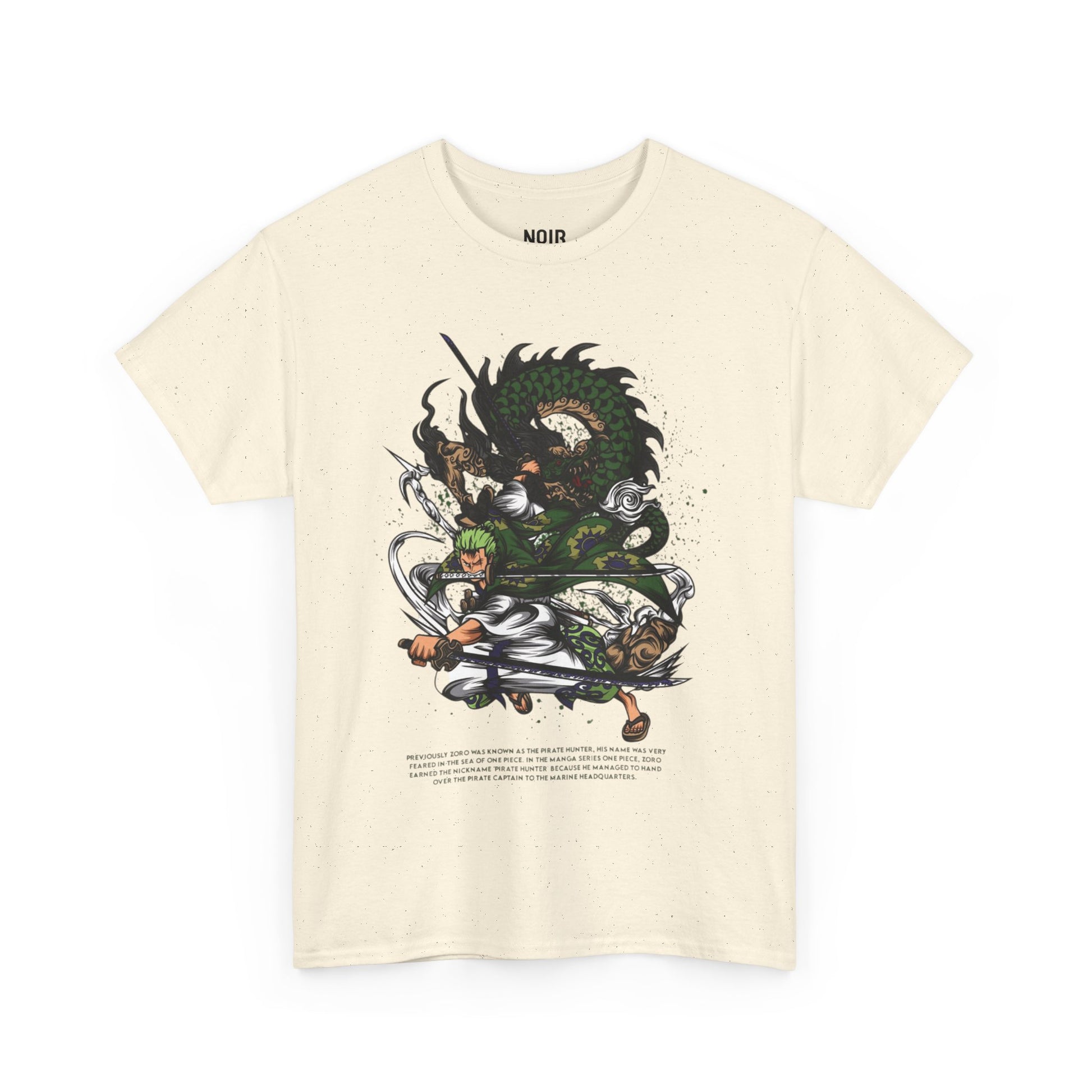 A whirlwind of steel and spirit, this graphic catches Zoro mid three swords draw as a jade dragon curls behind him like living haki, all slashed in sumi-ink arcs and debris flecks to sell the speed. Color rides a disciplined spectrum oni-green hair and scales, bone white gi, charcoal blacks, warm bamboo tans, with tiny pops of ember orange on geta and dust sparks so the movement reads first and the details reward a second glance. Linework stacks thick-to-thin brushes for manga energy; you’ll spot stippled shadows in the folds, micro nick marks along the blades, and a misted overspray around the serpent that gives the whole scene a pressure-wave glow. Printed big and centered for poster impact, we use a bright underbase on white cotton to keep the greens luminous, then matte inks for a paper-page finish that won’t glare under daylight. The composition lands like a crest: Zoro driving forward on the X of his stance, serpent coiling as a protective halo, fragments orbiting to imply a single decisive cut.